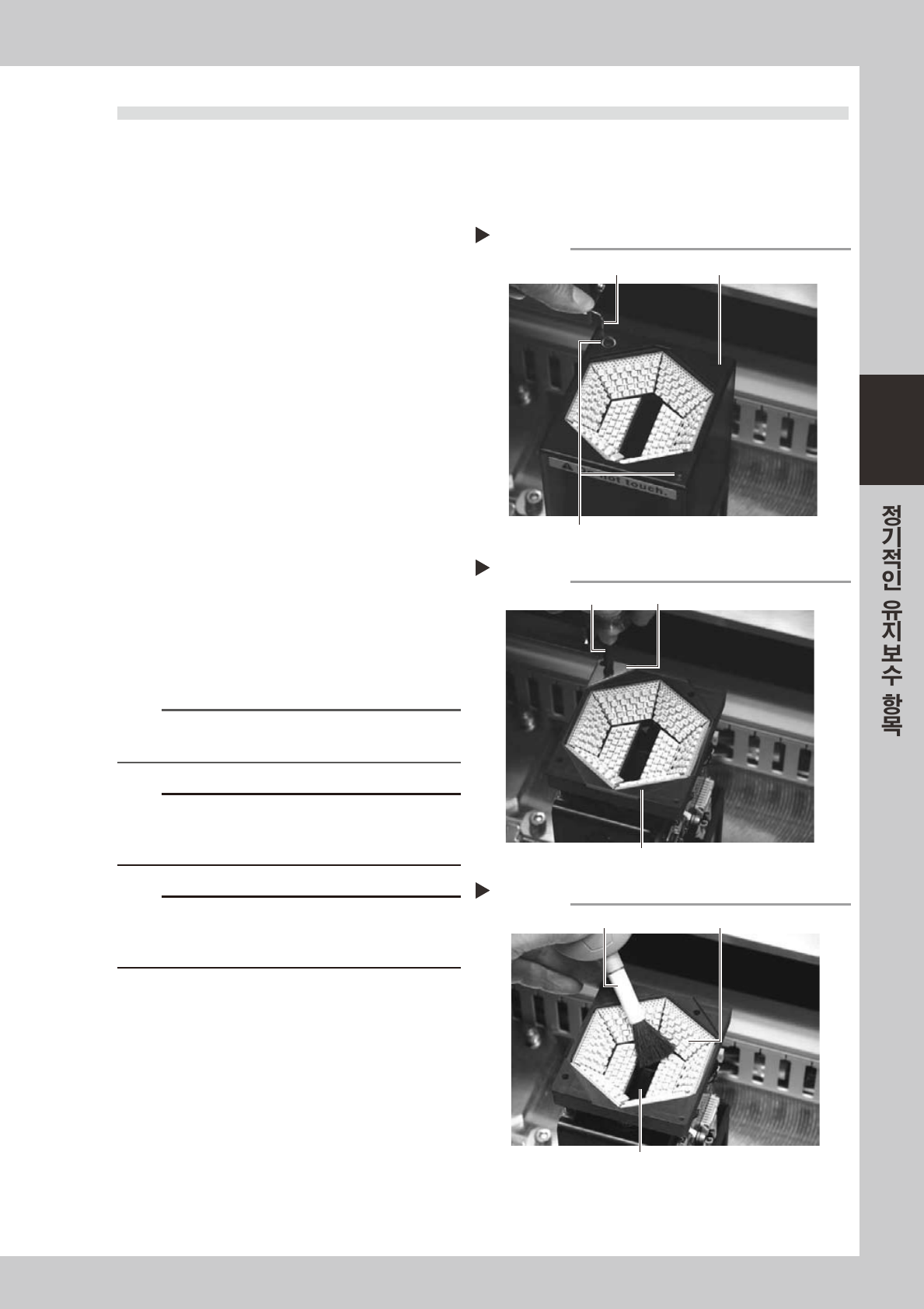 3-34 3 4 . 7 스캔 카메라 조명 ( 6 개월 ) - - - Y S 1 2P 스캔 카 메 라 조명 확산판 및 프 리즘은 카메라 왼 쪽 단의 개구부 에 장 착되 어 있 습니다 . 먼지 등에 의해 스캔 카메라의 조 명 확산판 • 프리 즘 이 더 러워 질 경우 가 있으 므 로 , 정 기적 으 로 청소 해 주 십시 오 . c 주의 청 소시카 메 라각 부에강한힘을가 하지않 도 록…