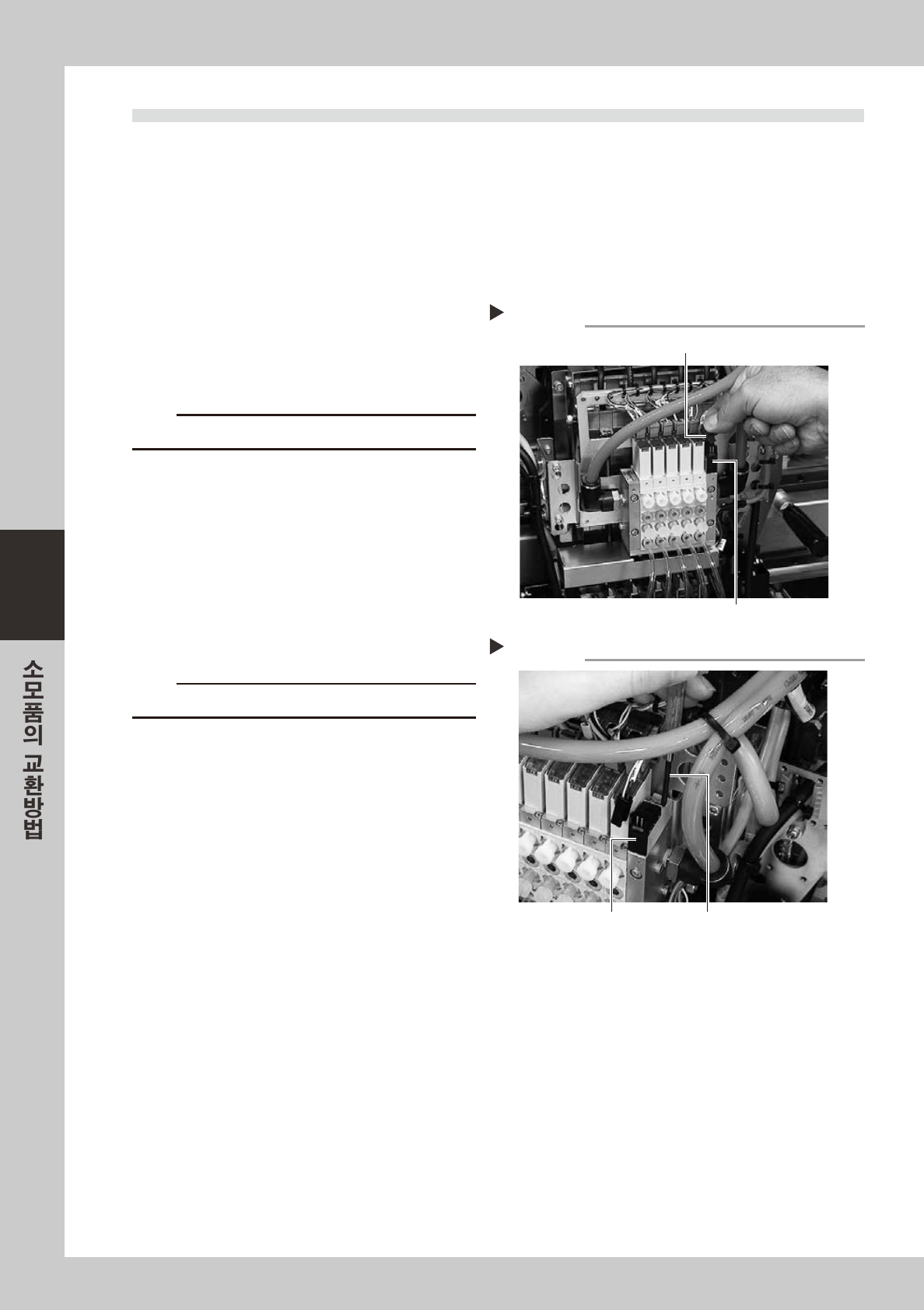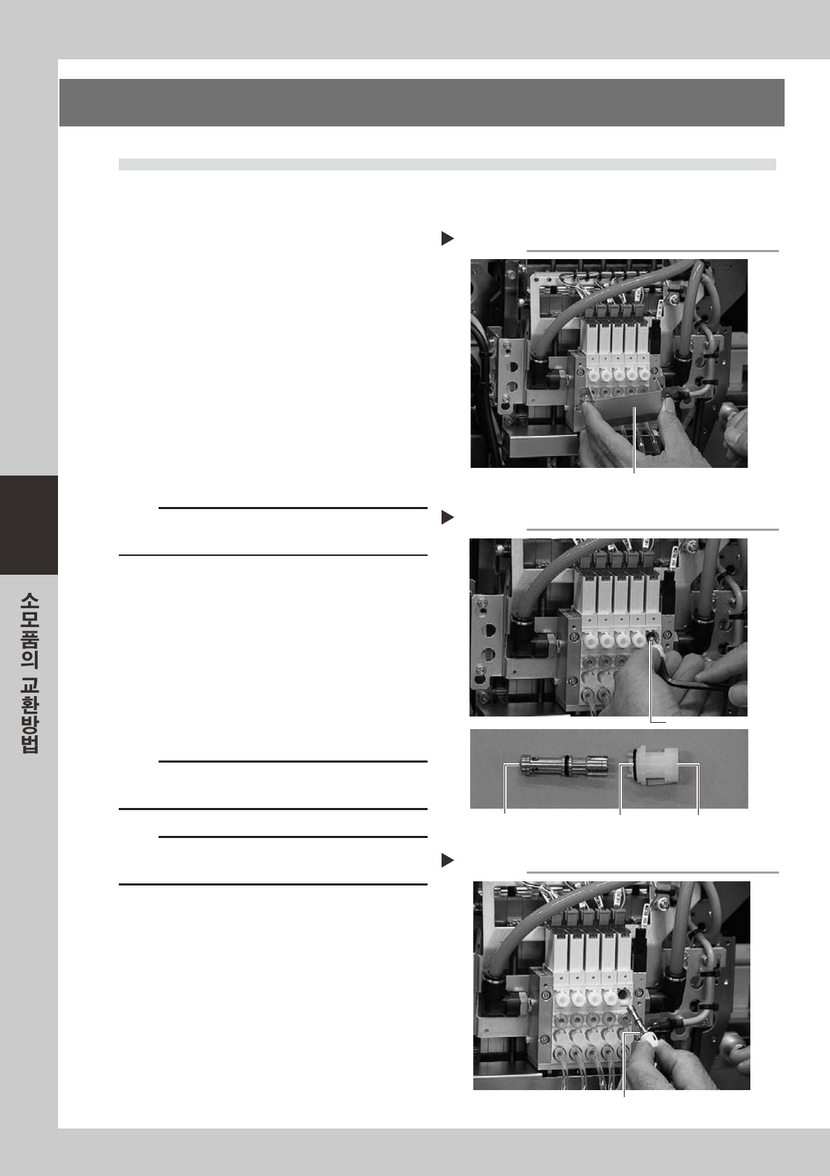 4-3 4 2.2 솔레노이 드 코 일 의 교 환 1 공 급에 어와 장비의 전원을 차단합 니다 . 소프트웨 어 를종 료 하 고장비의전 원 스위치 를O FF 한후 ,장비좌 측하단판넬안의 「에 어 공급 / 배 출」 밸 브 를우측 으로돌려서에 어 공급을차단 해주십 시오 . 57 405-L6-00 2 헤드를 작 업하기 쉬운 위치로 이동시킵 니다 . 3 이젝터용 하네 스 의 컨…