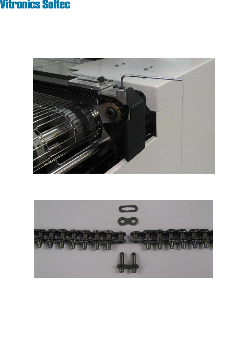 2. Run the conveyor until the master link for one of the chains comes up just under the rail. Remove the