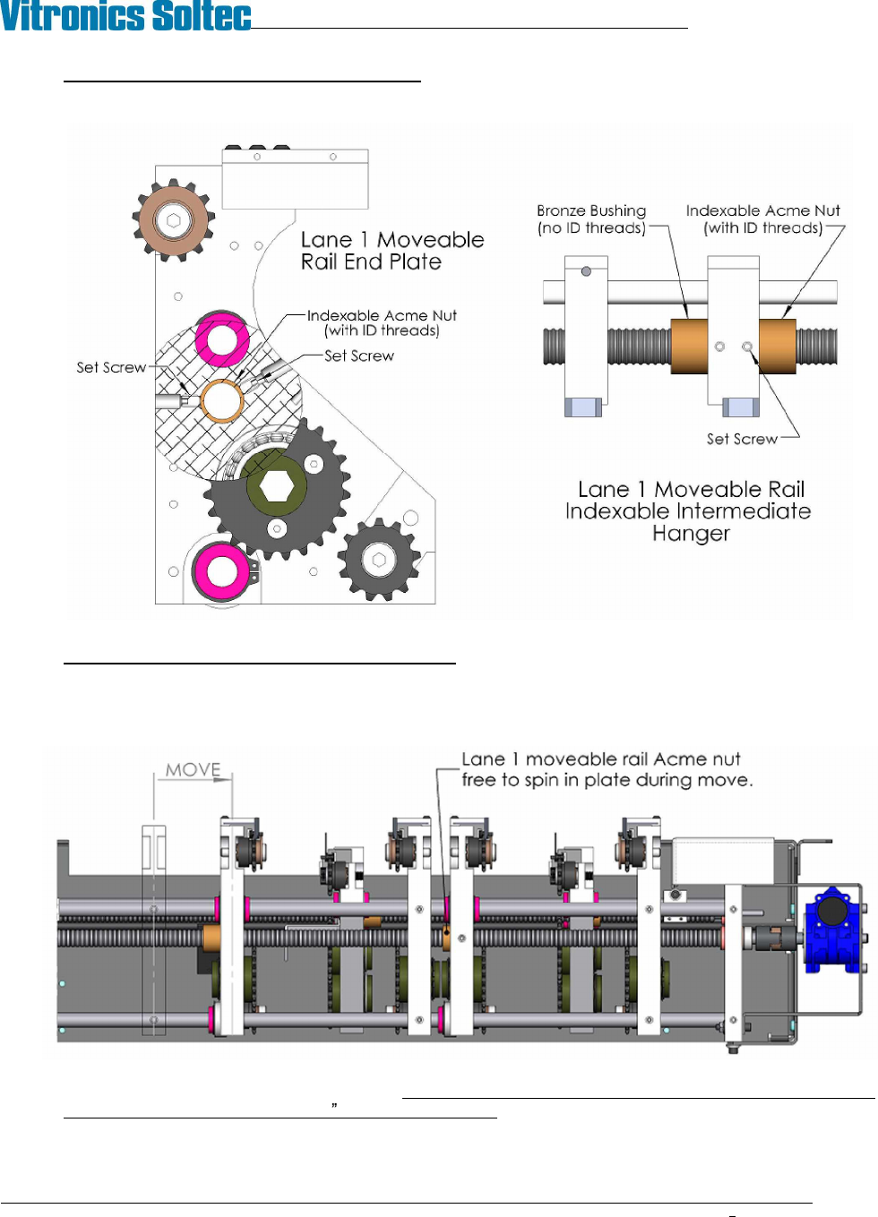 14. When the moveable rail is close to position adjust each of the lane 1 moveable rail Acme nuts to achieve