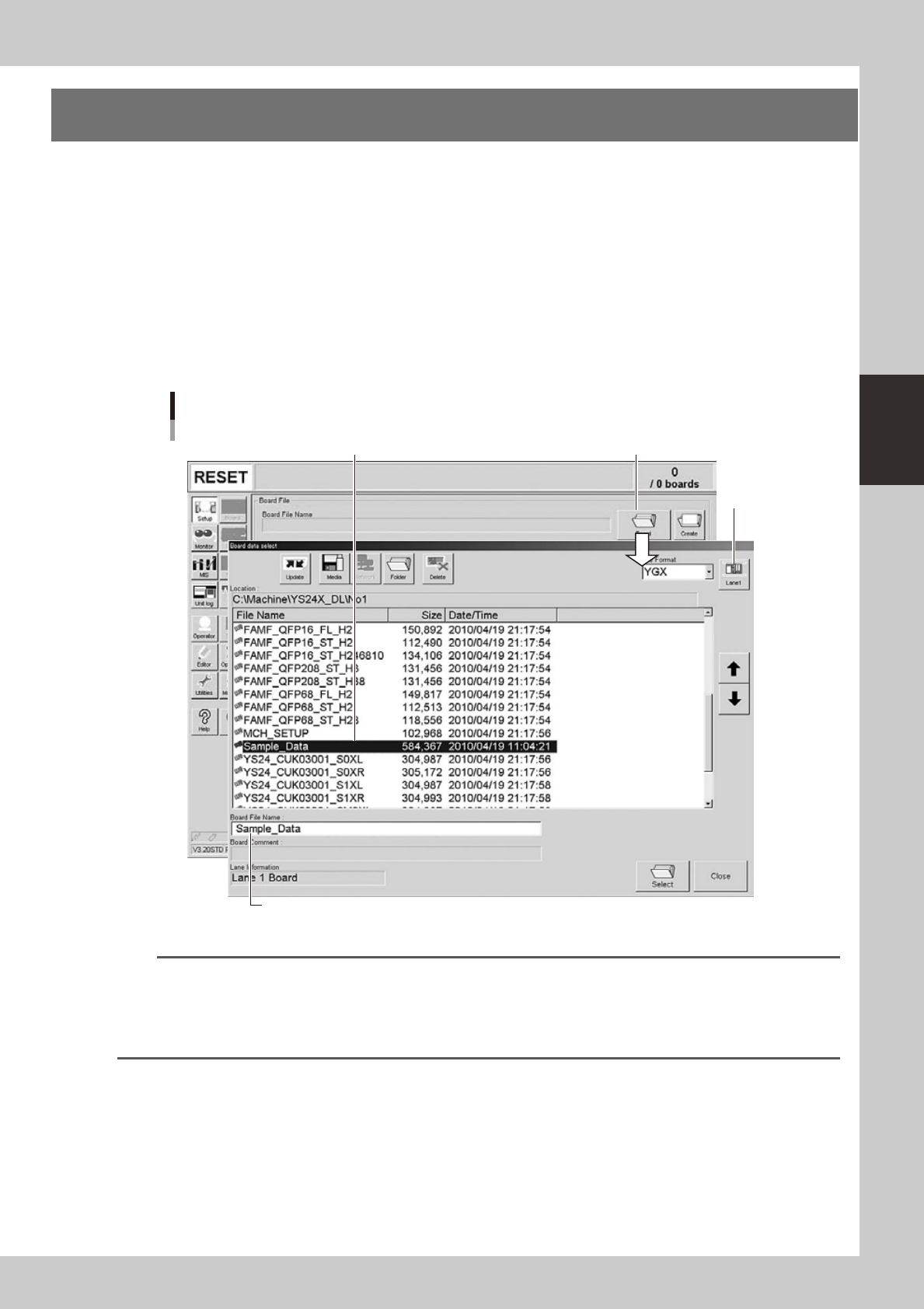 3-1 3 Starting and ending pr oduction 1. Star ting production This section describes how to select the board data which is already registered and perfor m component mounting. 1 Select the board data. 1. When the board da…