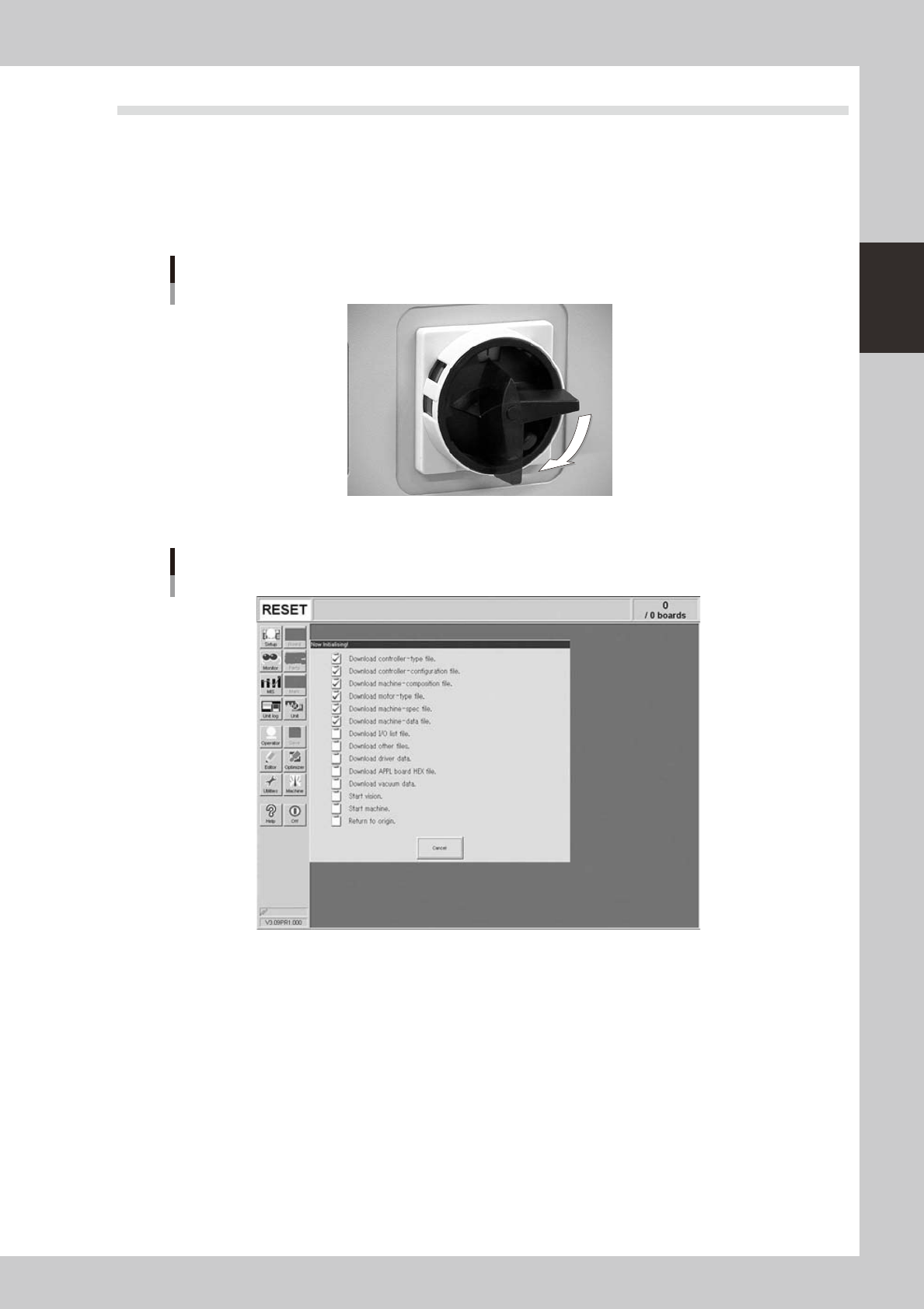 system has started, the Initialization screen appears and the program necessary for machine operation