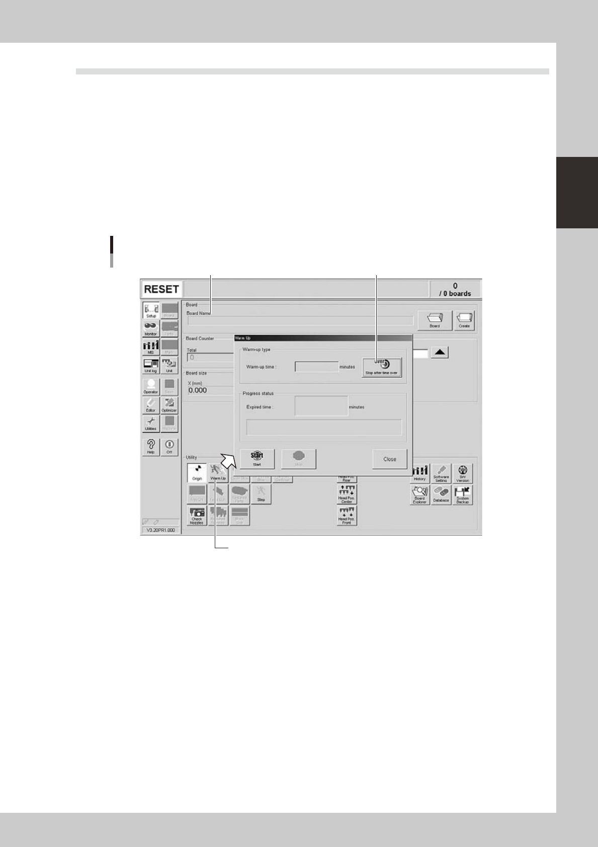 Press the [Warm Up] button on the Setup screen.