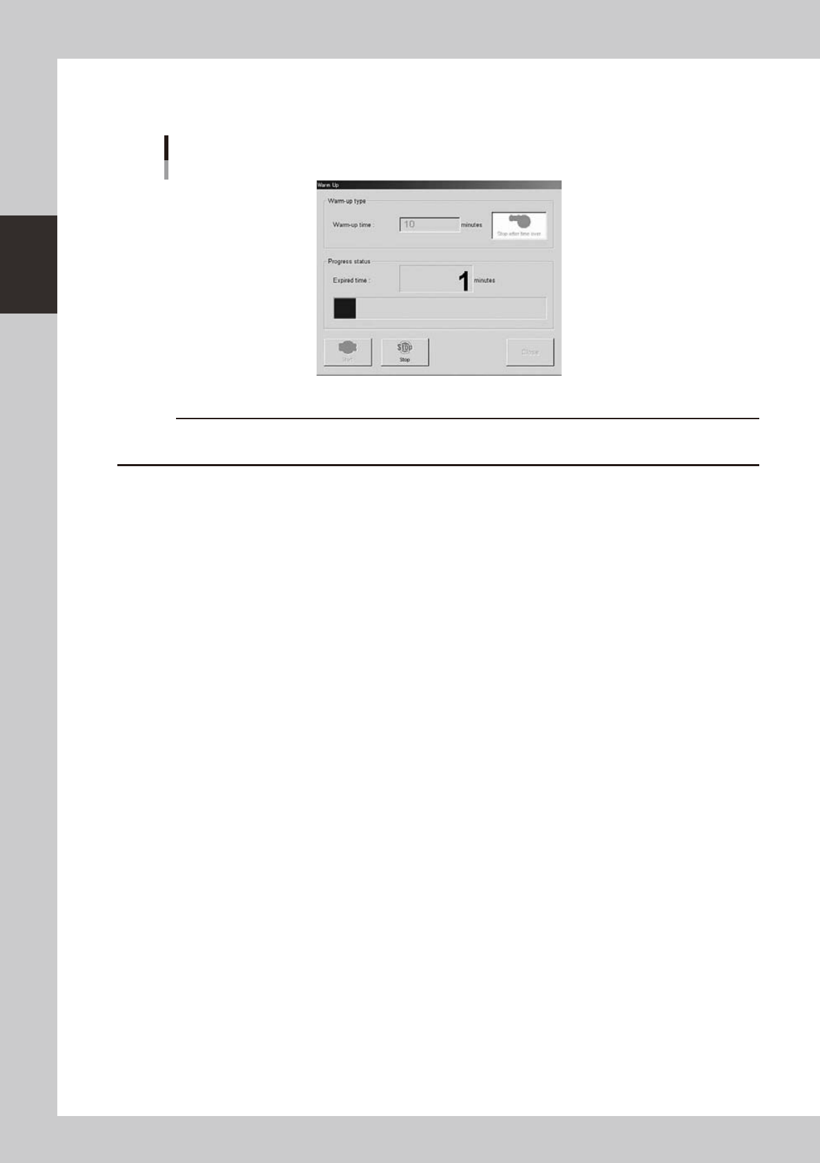 Warm-up will automatically stop when the warm-up time you set is reached. Press the [Close] button,