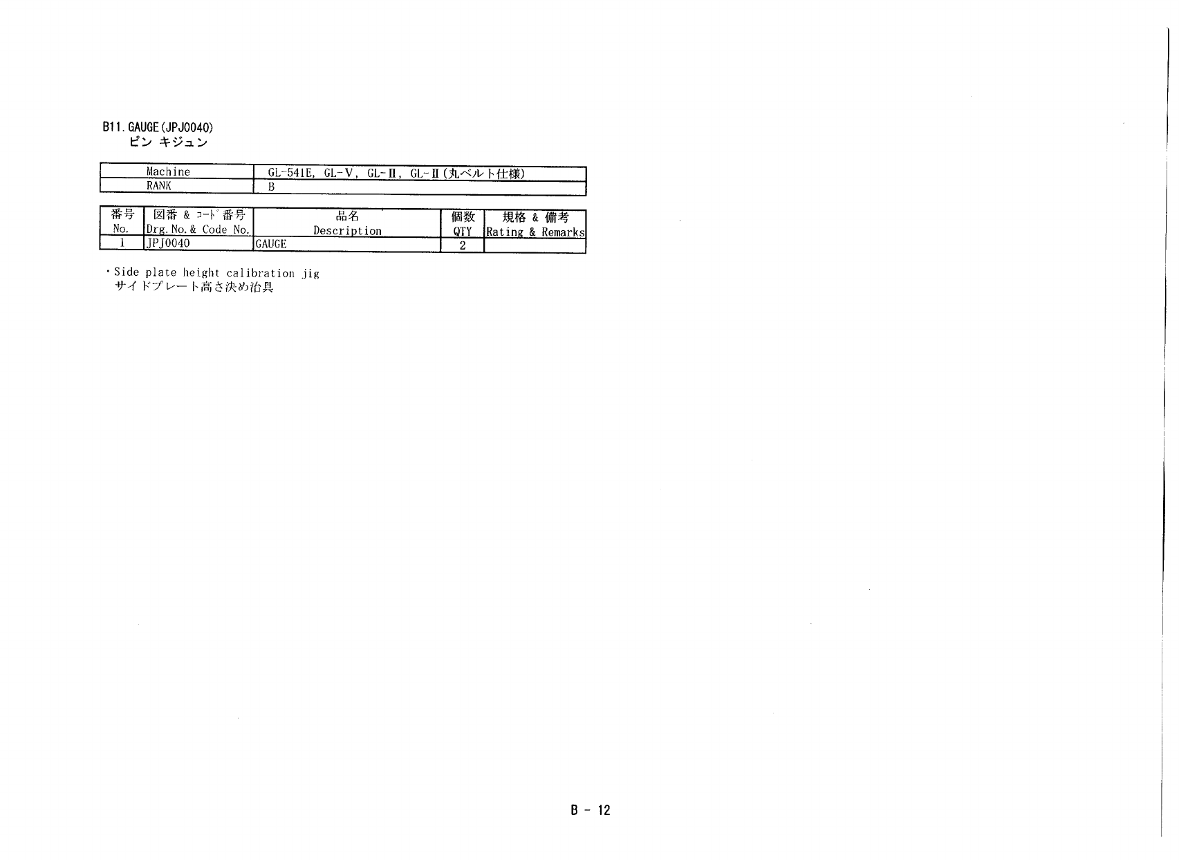 B 11 . GAUGE ( JPJ 0040 ) t ° > GL - 541 E , GL - V , GL - D , GL - II ( 丸八少卜仕様 ) Machine RANK B 番 号 図 番 & 番 号 No . Drg . No . & Code No . 規 格 & 備 考 品 名 Description 個 数 QTY Rating & Remarks JPJQ 040 GA…