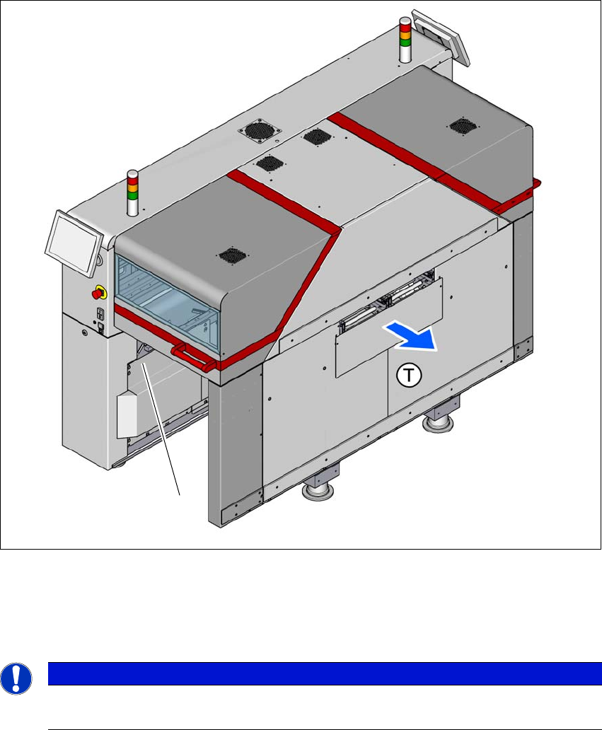 使用手册 SIPLACE TX 1 介绍 使用软件版本 714.0 或更新 12/2020 1.5 贴片机说明 27 1.5 贴片机说明 1.5.1 贴片机序列号 贴片机的序列号可在 1 号位置的贴片机框架内侧的铭牌上找到。 1 图 1.5 - 1 含序列号的铭牌的位置 (T) 行程方向 (1) 铭牌 1 请注意 铭牌上的额定电气规格 铭牌上的额定电气规格均为最大 值。实际消耗的电功率取决于贴片机配置与贴片程序。 (1)
