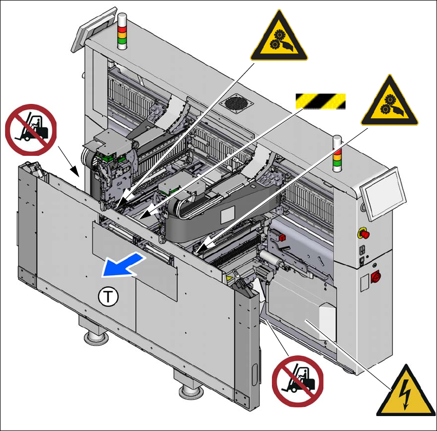 使用手册 SIPLACE TX 2 操作安全 使用软件版本 714.0 或更新 12/2020 2.2 警告标签 45 图 2.2 - 6 贴片机上的警告标签 (对于中国标签,示例如 SIPLACE TX2i 所示 ) (1) 护手装置上的警告条,内部 项目 W 006,部件号 - 031556 31-01 项目 W 204-CN,部件号 03149290- 01 项目 W 012,部件号 03155378- 01 (T) 行程方向 警…