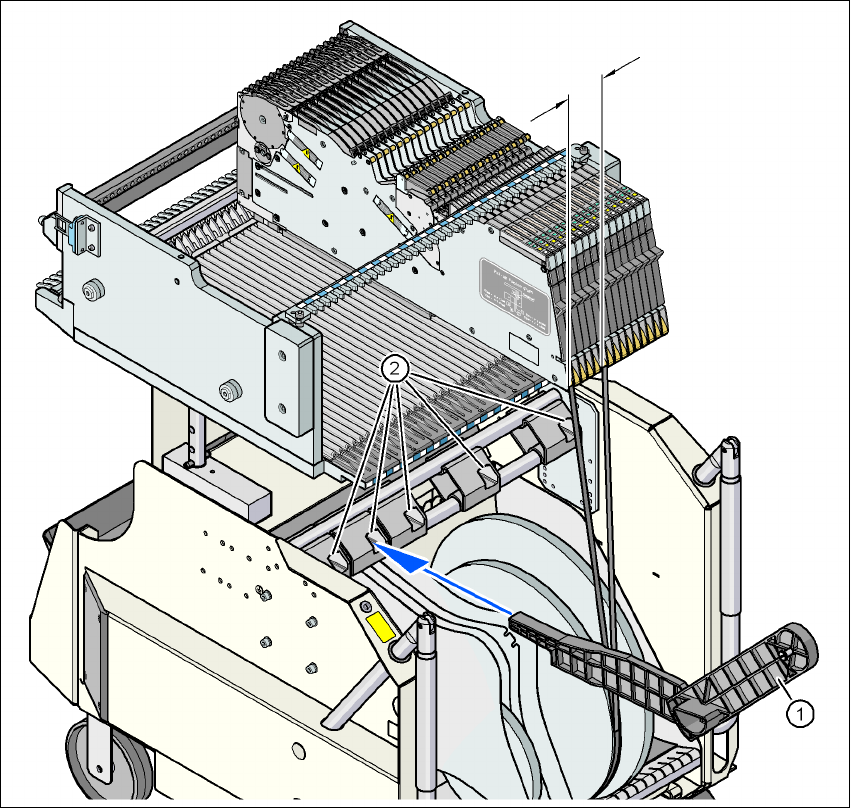 - 7, sivu 220) napsahtaa kiinni syöttömoduulin lukitusrullaan (pos. 1 kuvassa 3.9 - 1, sivu 166).