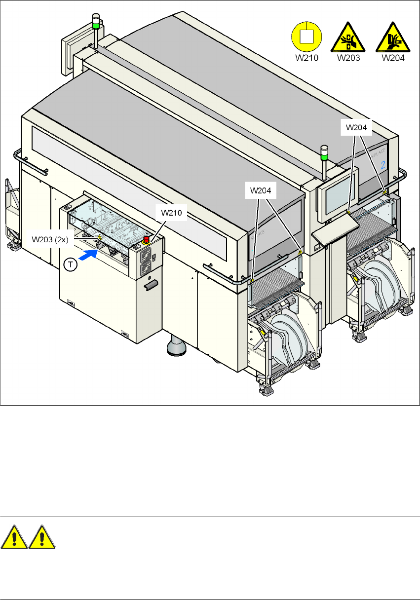 2 Käyttöturvallisuus Käyttöohje SIPLACE X-sarja 2.2 Varoituskyltit Alkaen ohjelmisto v ersiosta SR.605.xx Painos 07/2008 FI 44 Kuva 2.2 - 2 Automaatilla olevat varoit uskyltit W203, W204 ja W210 - osa 2 Pos. W203, artikk…