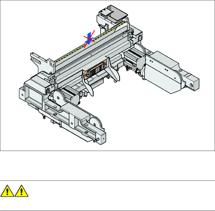 2 Käyttöturvallisuus Käyttöohje SIPLACE X-sarja 2.2 Varoituskyltit Alkaen ohjelmisto v ersiosta SR.605.xx Painos 07/2008 FI 52 2.2.3.5 V aroitusjuovat komponenttivaunun sisäänvetulaitteiston tyhjänauhajohtokanavassa (HF-…