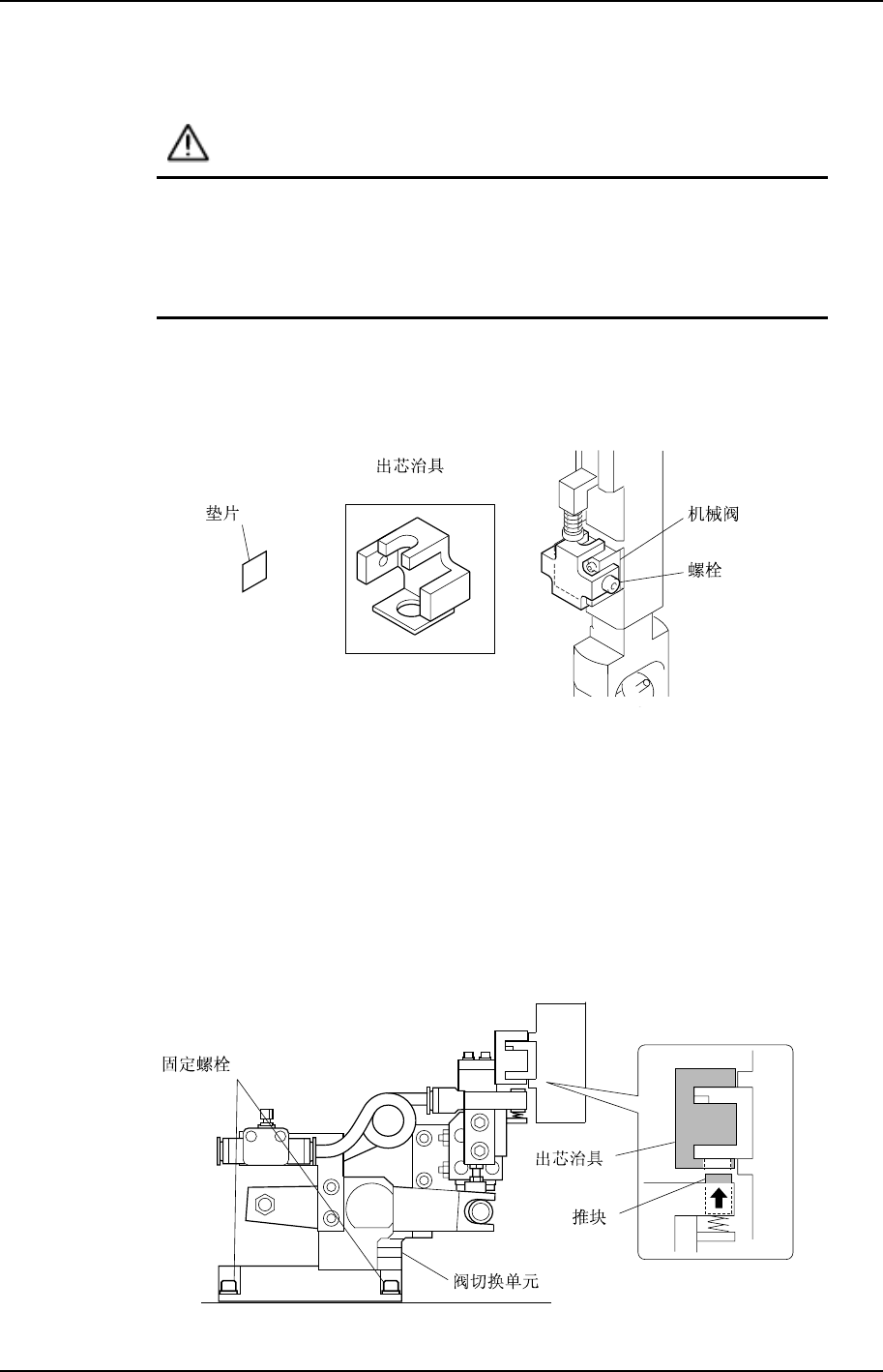 拧松固定螺栓,调节高度调整螺栓,将机械阀下面与推块托座上面的间隙设置为