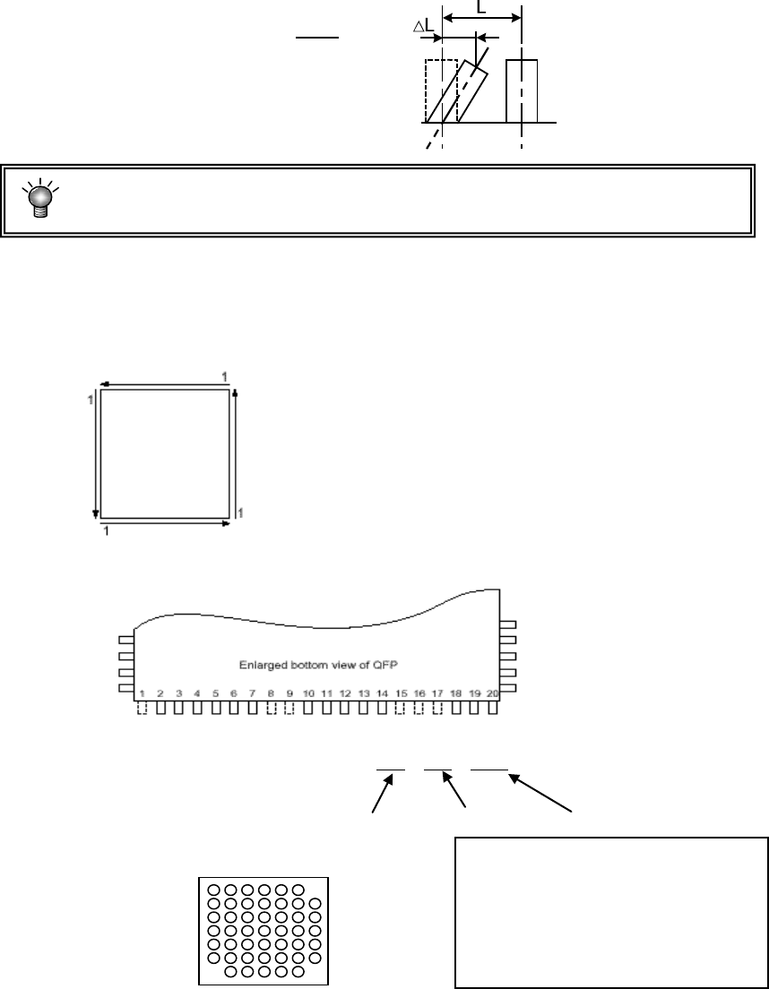 第 4 章 生产 程序制作 6 )弯曲 为了检查引脚水平方向的弯曲,设置检 测水平值。该值是相对于引脚间距的引脚弯曲率。通 常请设置为 20% ~ 30% 。 若缩小判定值,检查将变得严格。 另外,用可选的共面性功能来检查引脚的垂直方向 ( 引脚悬浮检查 ) 。 7 )欠缺开始 / 欠缺数 引脚或球有欠缺时,输入其信息。 欠缺信息可分别在 4 个方向上设置, 1 个方向最大可设置 3 处, 各个面上计算引脚的方向如下图所示。 例 ) 下…