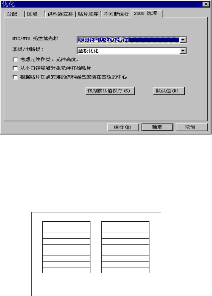 第 4 章 生产程序制作 4-4-1-2-6 2000 选项 选择“ 2000 选项 ”的标签 ,则显示下图的 对话框。 ① 同一托盘集中配 置指定 对于由 MTC/MTS 供给的同一品 种托盘元件, 指定是进行集中配 置,还是以供给速 度优先,进行 配置。 ● 同一托盘集中配置: 用同一元件 种类单位来配 置。 ● 供给速度优先配置: 以供给速度 为优先进行配 置。 图 4-4-4 同一托盘 元件的 配置例 ② 基板 / 电路:指定以…