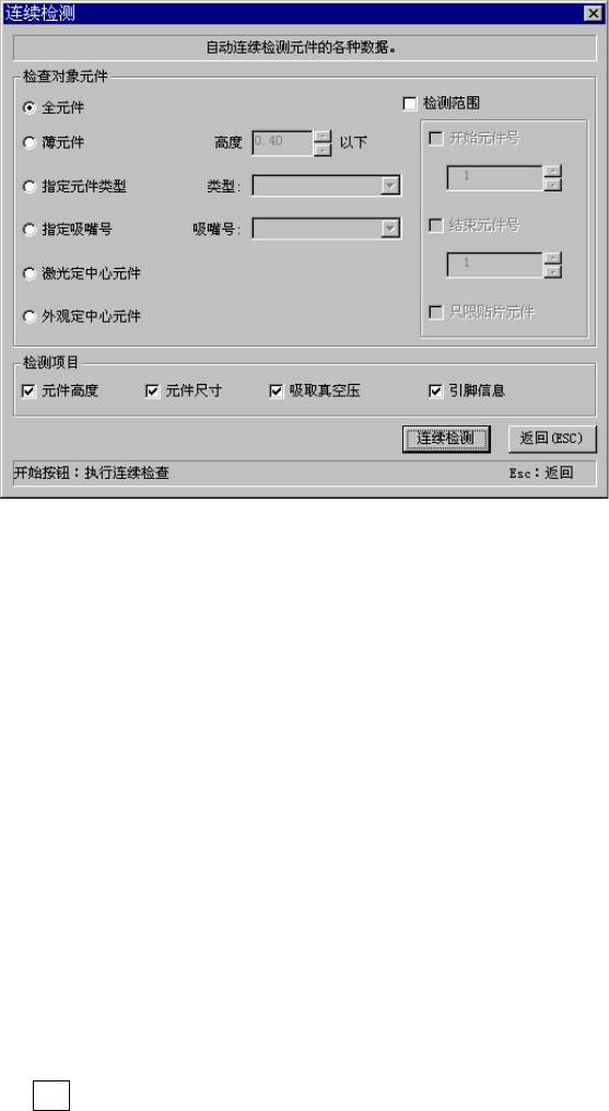 第 4 章 生产程序制作 3) 连续检测 检测所有指定的 元件。 ① 连续检测条件的 设定 从菜单栏中选择 “机器操 作” / “检测” / “连续检 测”,显示如下 画 面。 图 4-5-29 连续检测 条件的设定 (1) 检测对象元件 仅在检测与元件 数据中某 一条件相一致的 元件时设 定。 (2) 检测范围 从作为对象的元 件的条件 上,进一步归纳 某个元件 编号,进行检测 的情况下 检查。 ● 开始元件号:当 指定开始 检测的元…