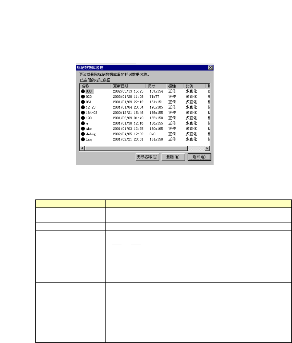 在一览表中显示数据库中储存的标记数据。各项目的含义如下。
