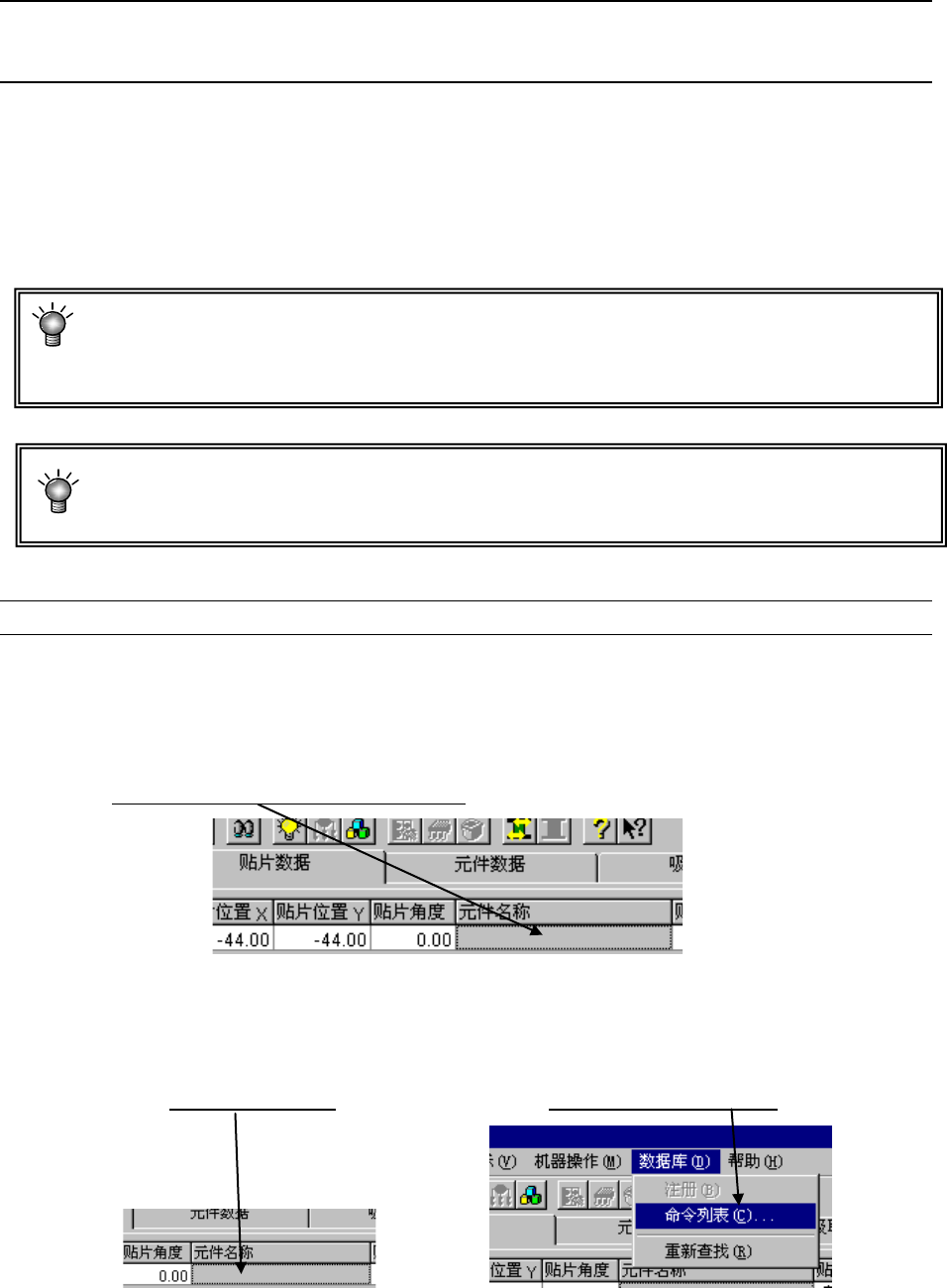 ① 请单击空白的元件名称栏。 ② 请单击“数据库”/“命令列表”。