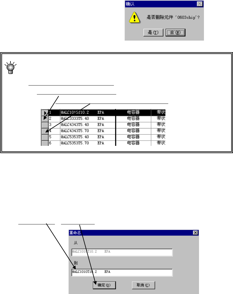 第 5 章 其它 功能 (5) 删除 删除元件名。 < 步骤 > 1) 选择要删除的元件名,在菜单栏中单击“数据” / “删除” 。 2) 显示右图的确认画面。 单击“是”,即被删除。 如何删除多个元件 指定删除范围后进行删除。 ●在数据库中指定范围的方法示例:指定第 1 行至第 3 行,见图示。 先点击要删除的首位元件的此处。 再按“ Shift ”键,单击要删除的最后元件。 (6) 重命名 更改元件名。 < 步骤 …