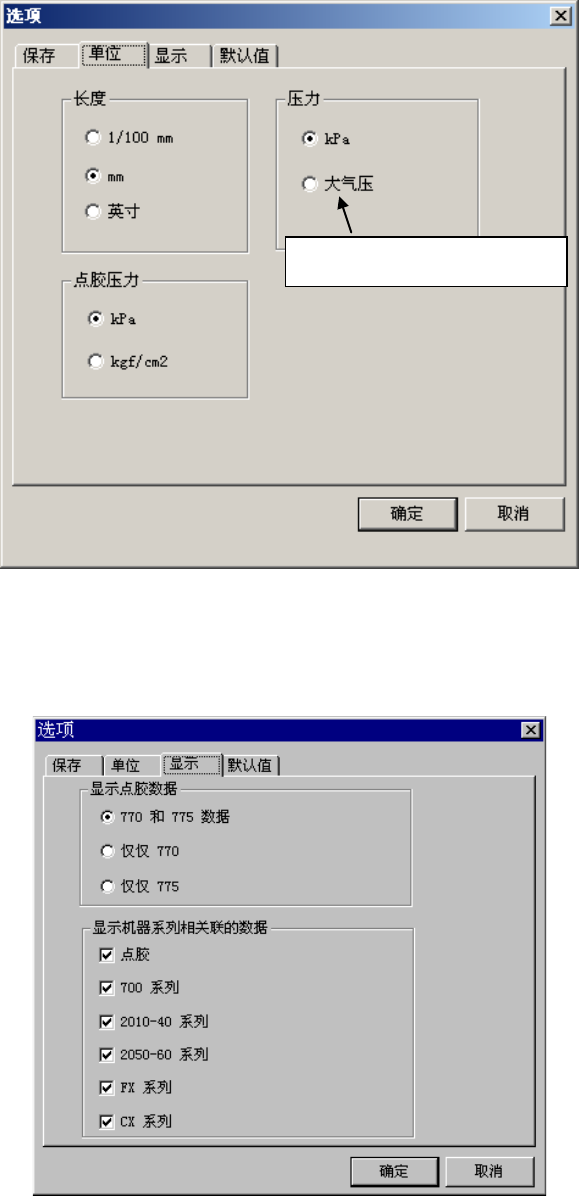 指定长度和压力的单位。在 KE-2050R/2055R/2060R 中没有使用“点胶压力”