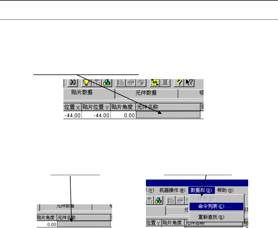 ① 请单击空白的元件名称栏。 ② 请单击“数据库”/“命令列表”。