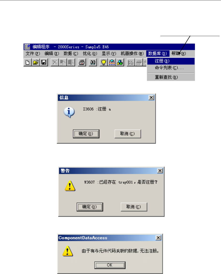 第 5 章 其它 功能 ( 4) 不变 更元件名,仅变更元件数据的内容 在“元件数据”中执行“命令列表”,则仅变更元件数据的内容。 < 步骤 > ① 进入“元件数据”的制作画面。 ② 请从元件清单中选择要变更的元件名。 ③ 请单击“数据库” / “命令列表” 。 ④ 从数据库的元件清单中,选择要 注册的元件数据的元件名,单击 “确定”。 5-28