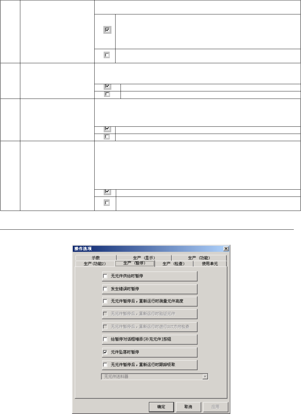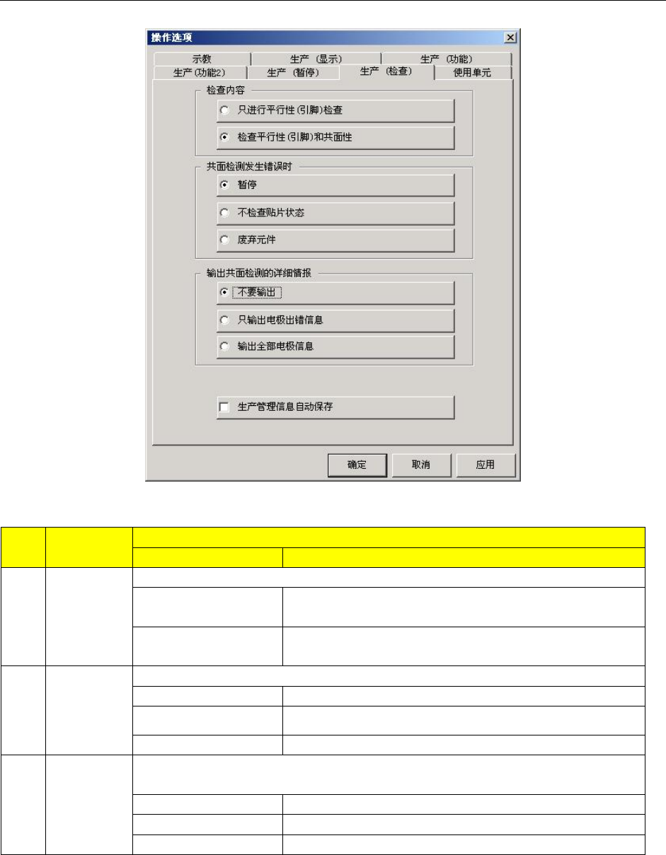 第 5 章 其它 功能 序号 项目 内容 状态 动作及详细内容 1 无元件供给时暂停 设置发生元件用尽时的运行模式。 元件用尽时,暂停生产。 生产中即使发生元件用尽, 只要有可贴片的元件, 即继续生 产。 2 发生错误时暂停 设置出错时的运行模式。 生产动作发生错误 ( 包括元件用尽 ) 时,暂停生产。 在生产过程中即使 发生生产动作错误,只要有 可贴片的元 件,则将继续生产。 3 无元件暂停后, 重新运行时 测量元件高度 设置元件用尽…