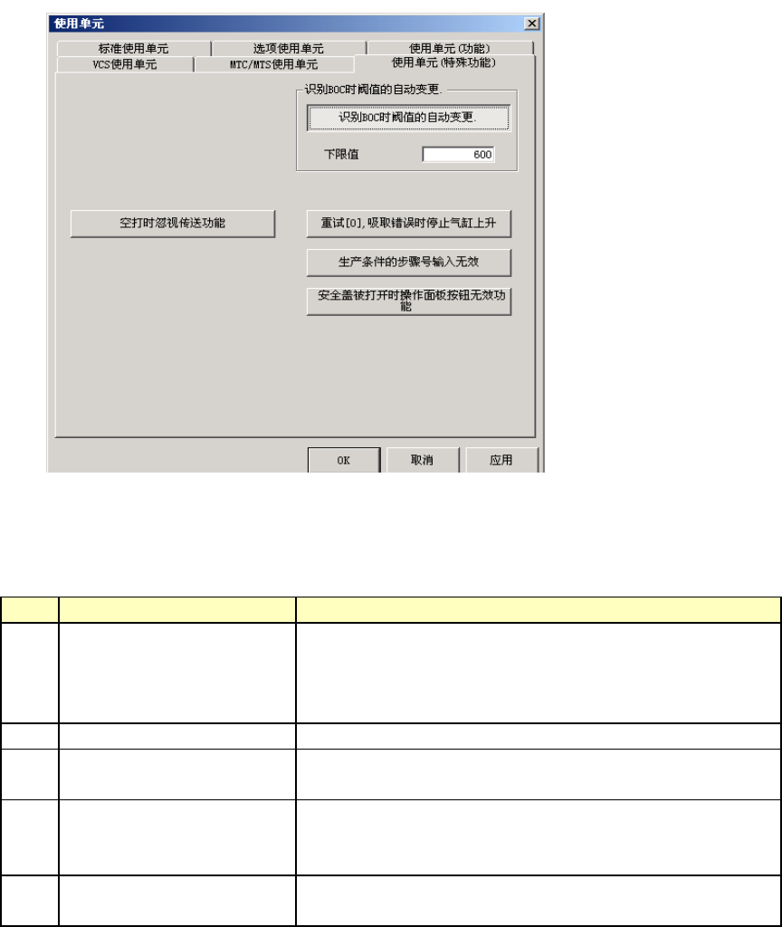 第 5 章 其它 功能 6 )特殊功能 根据使用环境,可以使用有效果的特殊功能。 应用中不适用时,可以设置为无效。默认设置中,特殊功能选项是被设置为无效。 图 5-33 特殊功能设置对话框 ● 设置项目 No. 項目 機能内容 1 识别 BOC 时阈值的自动变 更 识别已氧化的 BOC 标记时容易发生错误,因此不能识别时 识别阈值自动下降到机器设置中设置的下限值后, 再进行 识别。 在编辑框中输入阈值下限值。输入范围是 600 ~ 90…