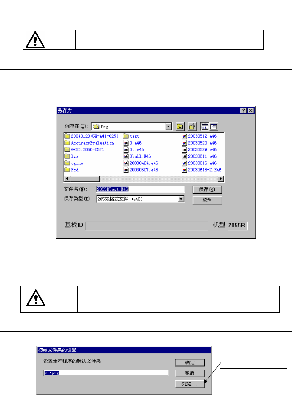 第 2 章 生产 2-6-3 覆盖保存 覆盖保存生产程序。 从菜单栏中单击“文件”/“覆盖保存”,则该文件被覆盖保存。 注意 覆盖保存后,原来的文件内容将被删除,敬请注意。 2-6-4 另存为 对于编辑后的生产程序,当要改变文件夹或指定文件名后再保存时,选择此项。 ① 单击“文件”/“另存为”。 ② 在“另存为”画面中,指定文件夹和文件名,单击“保存”。 2-6-5 文件管理 启动Windows的资源管理器。 可以对文件夹或文件进行删除…