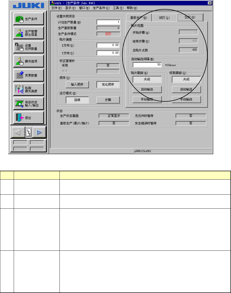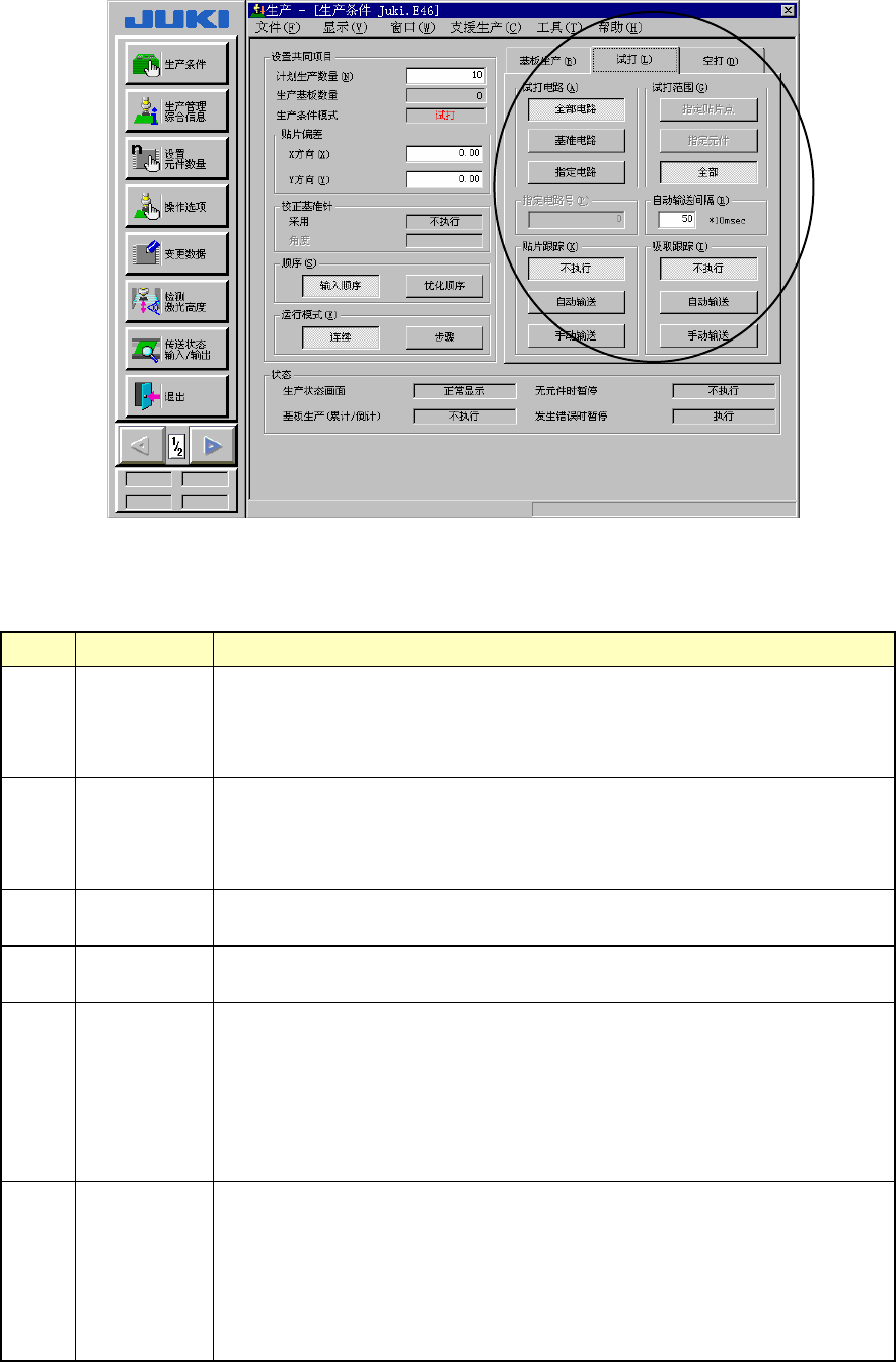 第 2 章 生产 2) 试打 图 2-22 试打条件的设定 No. 项目 内容 1 试打电路 设定进行试打的电路。当为单面基板时,不使用。 ·全部电路:对全部电路试打范围中设定的元件进行贴片。 ·基准电路:对基准电路试打范围中设定的元件进行贴片。 ·指定电路:对指定的电路试打范围中设定的元件进行贴片。 2 试打范围 设定试打范围。 ·指定贴片点:仅贴片数据的试打项设定为 YES 的贴片点。 ·指定元件:元件数据的试打项设定为进行的所有…
