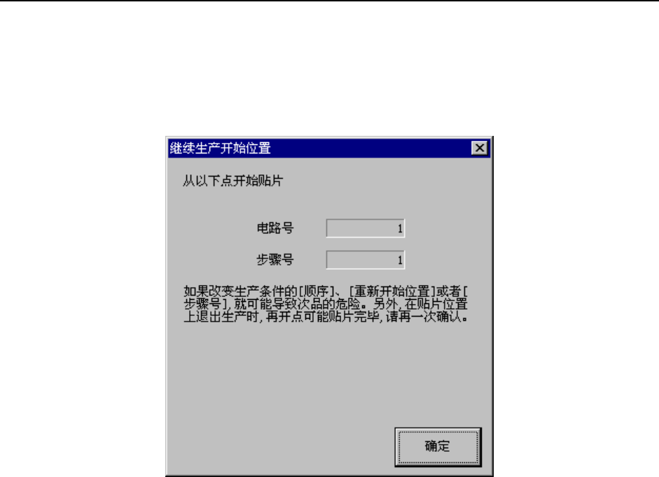 第 2 章 生产 2-11-10 继续生产 当生产异常终止时(发生非同步情况, 生产异常终止), 可通过以下步骤继续进行生产。 前提 条件是:至少要有一个元件完成吸取、贴片动作后才可。 2-11-10-1 生产异常终止 在异常终止的错误信息对话框中,按下“OK”按钮,显示如下画面。 图 2-65 开始继续生产的位置 在此按下“OK”按钮,则返回生产条件画面。 开始下一次生产时, 将确认是否从上述位置开始生产。 但如果已经通过程序编辑编辑…