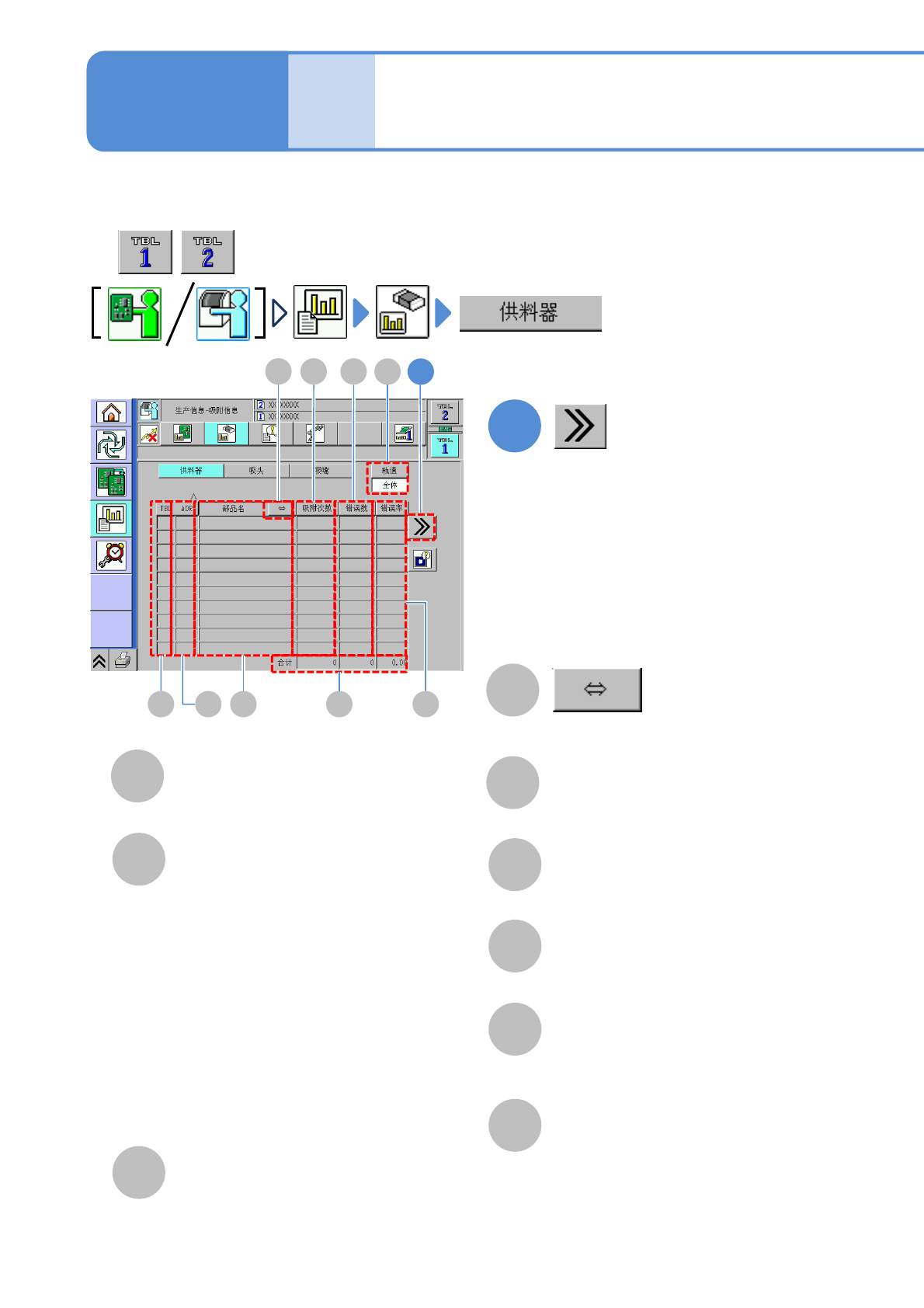 NPM-D3 EJM6DC-MB-03O-03 3-2-3 -2 A B C D E 选择表示的种类。 厚度 元件厚度的错误次数或者错误率。 贴装 贴装错误的次数或者错误率。 G I H 吸着 吸着错误的次数或者吸着错误率。 识别 识别错误的次数或者识别错误率。 返回原来画面。 J 落下 元件落下的错误次数或者错误率。 F 次数 率 吸着次数 各料架的吸着次数或者吸着率。 错误合计 各料架的错误次数合计或者错误率。 合计 所有料架的吸着…