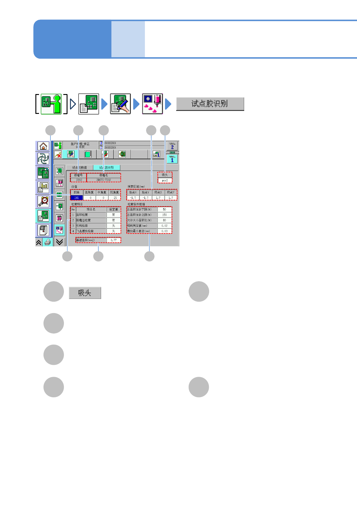 显示和设定试点胶识别时所使用的识别用数据。