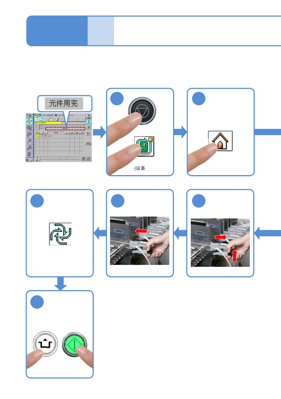 NPM- TT2 EJM1EC-MB-03 O-02 3-3-1 -1 元件的 补充 代替元件的补充 ( 智能供料器 ) 操作篇 3-3-1 ●请在工程师模式进行操作。 ●将通常使用的元件登录为「主元件 」,而将代替元件登录为「副元件」, 发生元件用完时,可以使用代替元件。 ・ 登录方法 ( → NP M-DGS 使 用说明书 6 章 ) ( 显示元件用完的提示 ) 2 10 9 8 或者 卸下主元件的供 料器 将副元件的供料器 安装到…