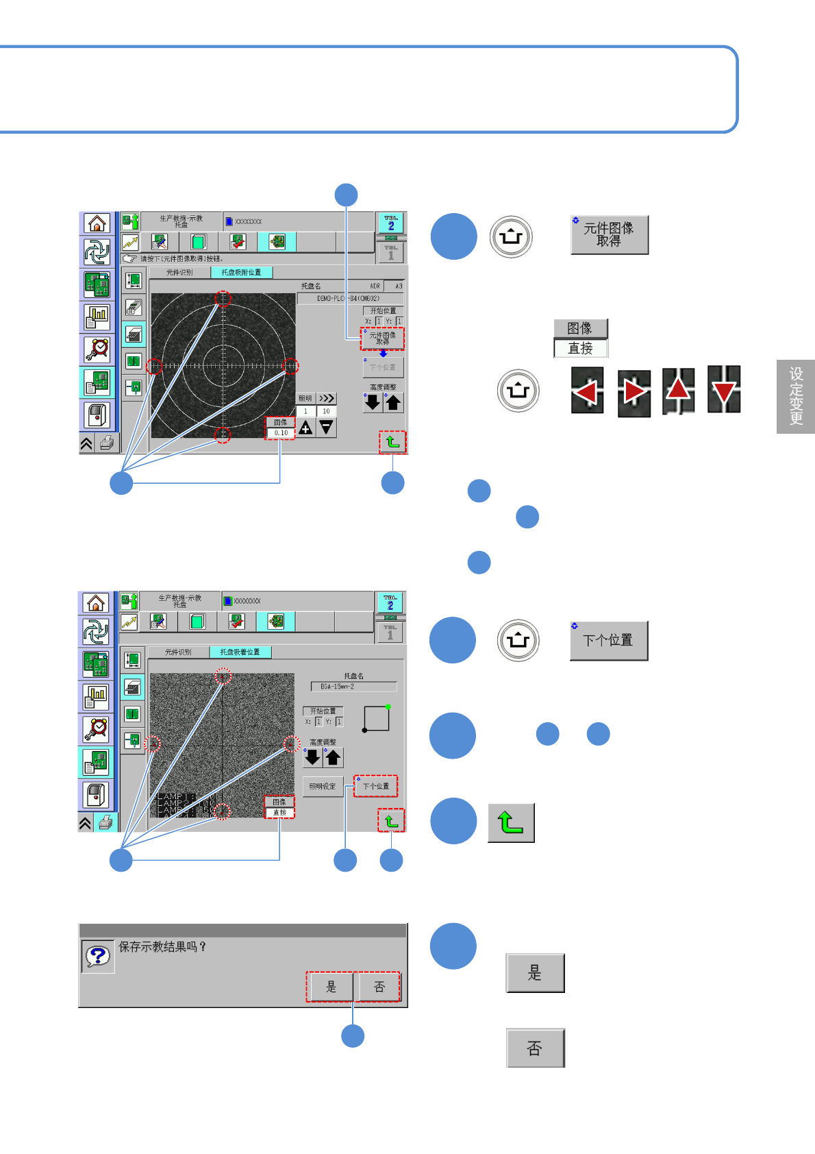 NPM- TT2 EJM1EC-MB-04 O-04 4-2-1 1 -4 5 + ●托盘收纳凹处中心偏移十字线中心 时 通过调节,对准中央移动。 切换为 + ■在 选择了“ 1 点模式”时 至 ■在 选择了“ 1 点模式”以外时 6 + ( 移动到下一个校正位置 ) 7 进行 ~ 操作,重复进行 点的识别 3 3 8 5 6 ■ 选择 1 点模式 ■ 选择了 1 点模式以外的模式时 5 5 8 8 9 9 确认提示 ■不保存时 8 6…
