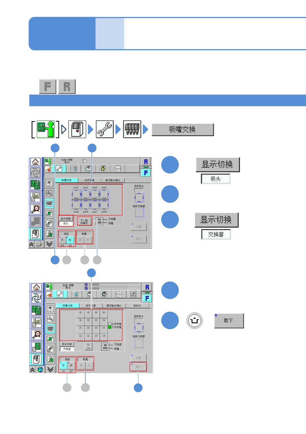 NPM- TT2 EJM1EC-MB-05 O-05 单元调整 贴装头的吸嘴更换 1 5-2-5 -1 操作篇 5-2-5 B C A 1 2 3 4 + 5 5 B C 1 2 4 3 选择设置在贴装头上的吸嘴,把其收 纳于吸嘴交换器,或者选择收纳在吸嘴交换器内的吸嘴,设 置在贴装头, 对这两种方法进行说明。 ● 都需要进行。 选择 吸嘴的拆卸 卸下贴装头的吸嘴,收纳于吸嘴交换 器。 选择需要卸下的吸嘴 在 选择 (按钮变成蓝色) 选…