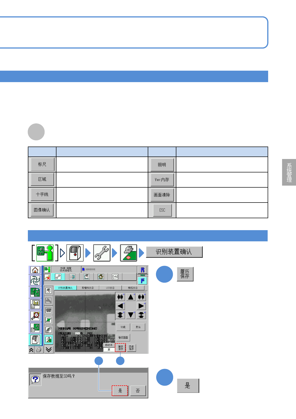 NPM- TT2 EJM1EC-MB-05O-0 5 5-2-10 -2 操作键 结果 操作键 结果 在画面上显示同心圆的标尺。 可以调整亮度。 在画面上显示四角框。 显示识别 系统的版本。 在画面上显示十字线。 清除正显 示的图像。 可以确认取得识别图像。 返回原来画面。 画面显示功能 1 2 1 2 E 确认提示 保存识别错误的履历