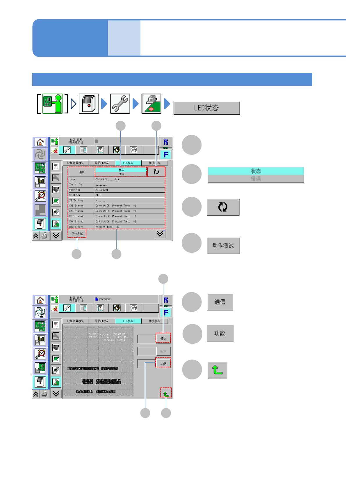 NPM- TT2 EJM1EC-MB-05 O-05 5-2-10 -5 单元调整 贴装头照相机 信息的确认 3 操作篇 5-2-10 确认 LED 状态 显示功能的状态。 F B E C D 各项目的状态和错误 更新为最新信息。 显示通信的状态。 G 返回原来画面。 A A E F G B C D 可切换显示的种类。 显示通信 / 图像的「 动作测试」画面。 ■ 「动作测试」画面