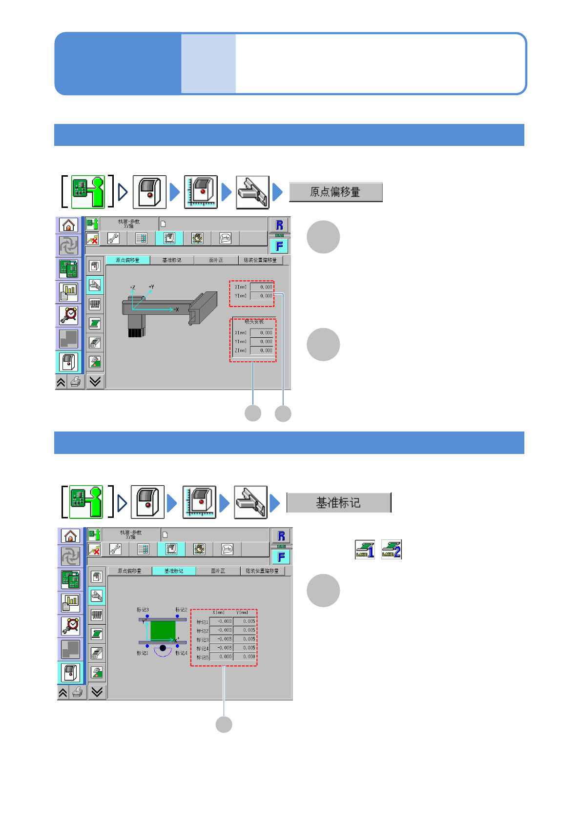 NPM- TT2 EJM1EC-MB-05 O-05 5-3-1 机器参数 XY 原点偏移量和 XY 基准标记的确认 A 原点偏移量 X[mm]/Y[mm] 作为 X 轴、 Y 轴动作基准的各 轴原点的偏 移值。 安装贴装头 X[mm]/Y[mm]/Z[mm] 安装贴装头时,作为 X 轴、 Y 轴动作基准的 各轴原点的偏移值。 B 設備に設置されている フィーダー の メモリー 情報 を表示します 。 XY 原点偏移量 确认 X 轴、 …