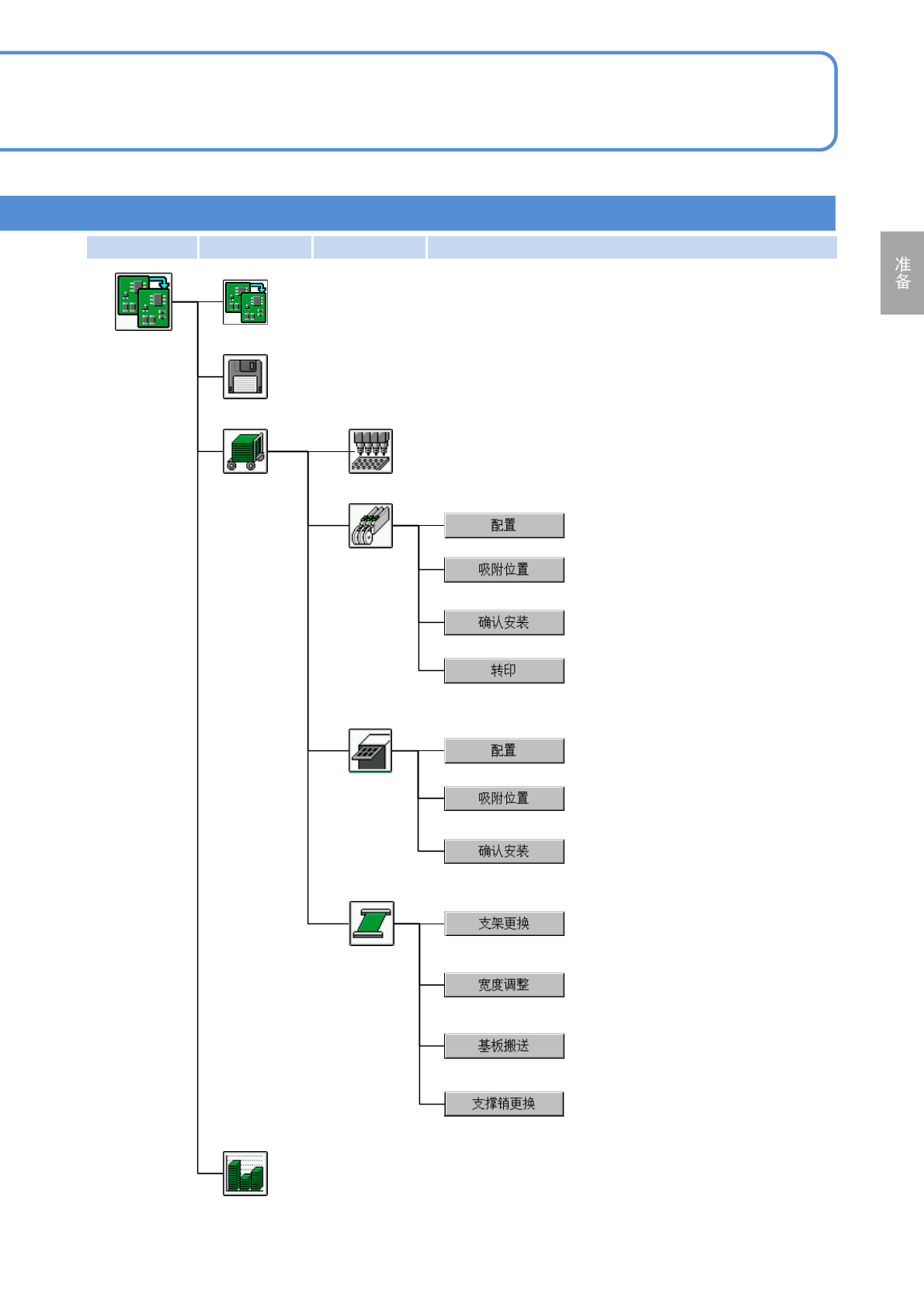 NPM- TT2 EJM1EC-MB-02O-0 4 2-2-2 -1 操作员模式 1 2-2-2 -1 各部位 名称 菜单构成 1 操作篇 2-2-2 主菜单 生产菜单 ( 生产前 ) 生产菜单 ( 生产中 ) 变更操作模式。 变更操作模式 生产开始 开始自动生产。 调整用软件开关 为了调试设备,暂时变更操作环境。 余数监视器 确认生产线上的各工作台的元件用完 信息。 确认吸着状況。 吸着监视器 状況监视器 显示运转中的生产信息,零部…