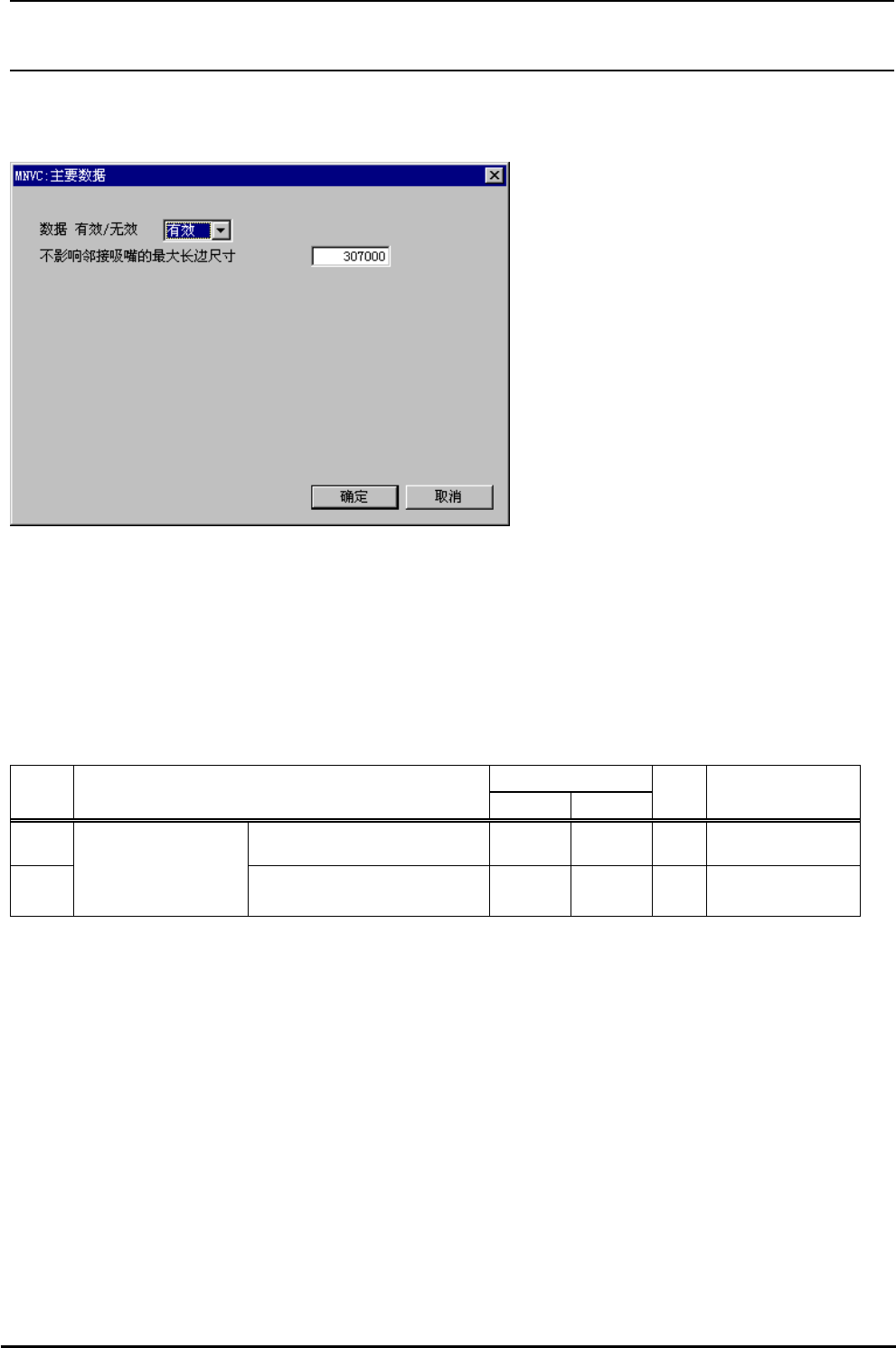 R e v 1 . 0 0 机械控制参数 4-4-9 MNVC 主数据 图 4-4-9 MNVC 主数据 (1) 设定画面的显示方法 菜单∶ [ 输入 ]→[ 画像 ]→[MNVC]→[ 主 ] 起动∶ [ 画像 ] 按钮 →[MNVC]Tab→[ 主数据 ] 按钮 (2) 设定项目 输入范围 № 项目 最小值 最大值 单 位 备考 1 数据有效 / 无效 0: 无效 1: 有效 2 主数据 被邻接吸嘴分配的最大长 边尺寸 0.1 μm…