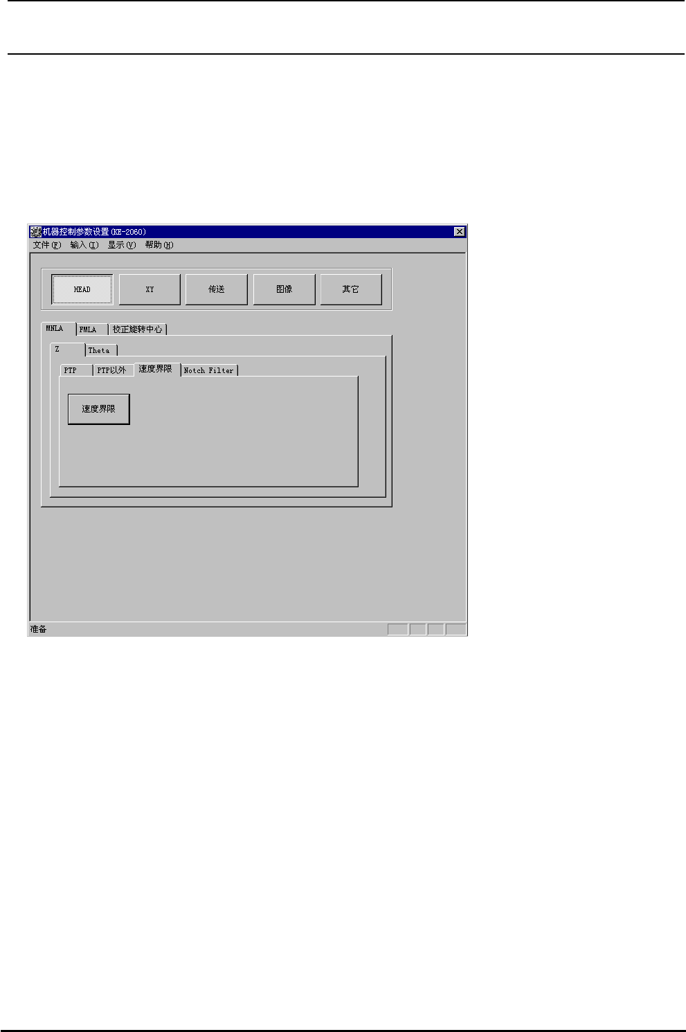 R e v 1 . 0 0 机械控制参数 3-1-5 速度限制的起动画面 选择了 [MNLA][ Z][ 速度界限 ] 或 [MNLA][T ][ 速度界限 ] 或 [FMLA][ Z ][ 速度界限 ] 或 [FMLA][ T][ 速度界限 ] 之 后,就会会显示出如图 3-1-5 所示的表格。 画面为 [MNLA][Z] 时的情形,其他也一样。 图 3-1-5 速度限制的起动画面 选择了 [ 速度界限 ] 按键之后,速度限制设定画面…