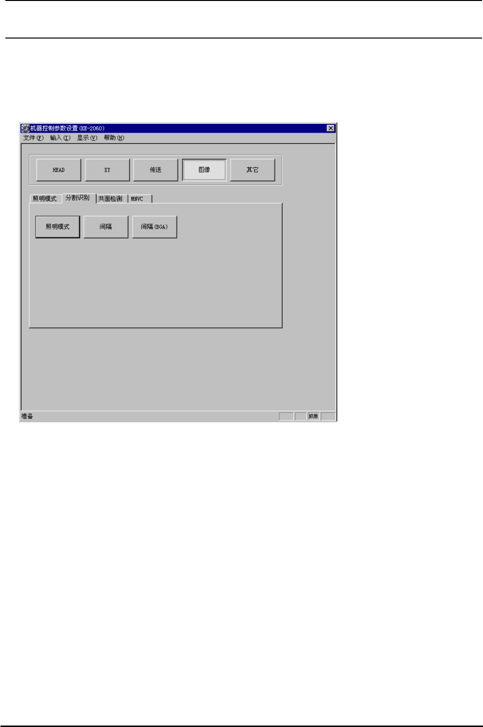 R e v 1 . 0 0 机械控制参数 3-4 3-4-4 所示的表格。 注 时, [ 分割识别 ] 标签和 [ 共面检测 ] 标签为非显示,因此不能选择。 3-4-1 照明图案的起动画面 [ 照明模式 ] 之后,就会显示出如图 3-4-1 所示的表格。 图像 选择了起动画面的 [ 图像 ] 按键之后,就会显示出如图 3-4-1∼ 图 ) KE-2050 选择了 图 3-4-1 照明模式的起动画面 选择了想编辑的项目按键之后,就会显示…