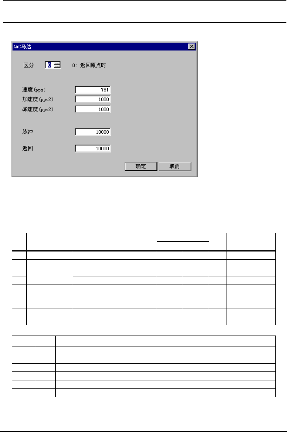 R e v 1 . 0 0 机械控制参数 4-3-2 AWC 马达 图 4-3-2 AWC 马达 (1) 设定画面的显示方法 菜单∶ [ 输入 ]→[ 传送 ]→[AWC 马达 ] 起动∶ [ 传送 ] 按键 输入范围 →[AWC 马达 ] 按键 ( 2 ) 设定项目 № 项目 最小值 最大值 单 位 备考 1 区分 0 9 参照 (3) 区分 2 速度 (pps) pps 3 加速度 ) 2 (pps2 pps 4 AWC 马达 ( …
