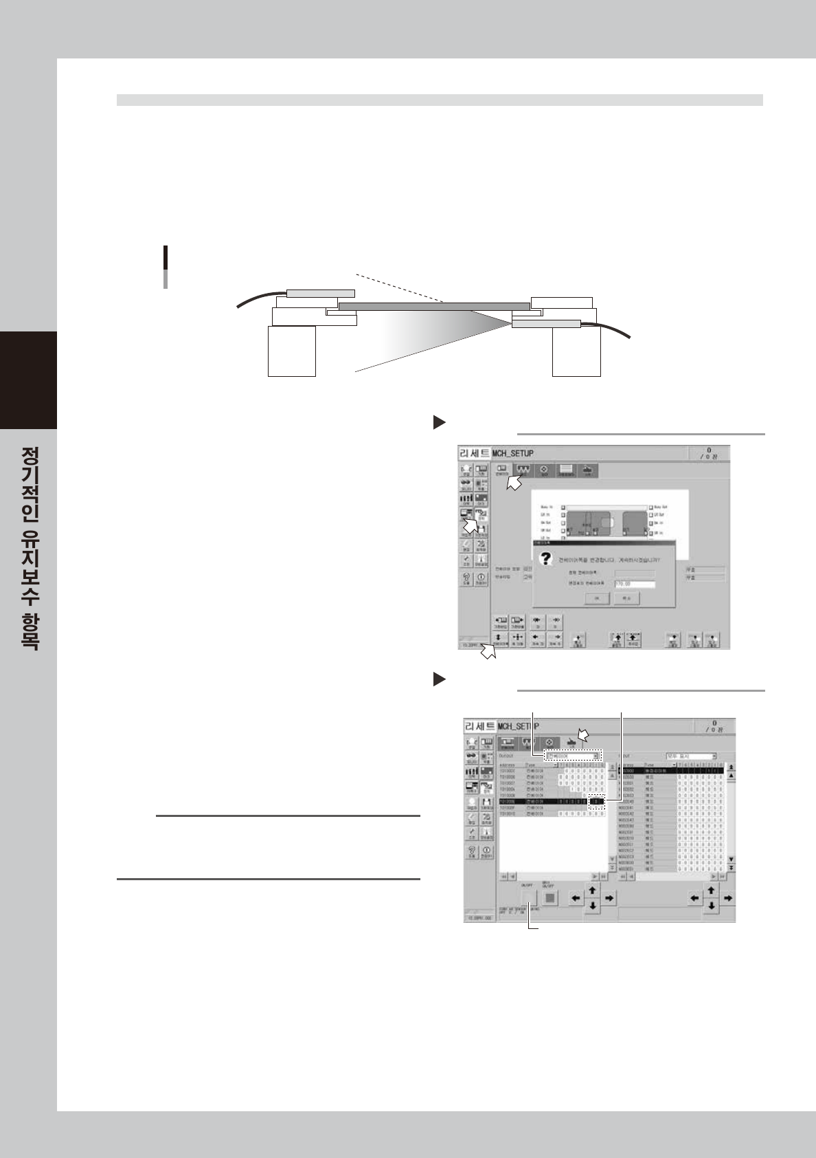 3-8 3 1 . 4 컨베이 어 센서의 상태와 동 작확인 본 장 비 에 서 는 컨 베 이 어 센 서 로서 투 과 형 파이 버 센 서 를 사용 하 고 있 습 니 다 . 컨 베 이 어 폭 이 바 뀌 면 , 투 광 - 수광 센 서 간 의 거 리 가 바 뀌 므로 , 센 서 의 수광 상 태 도 변 하 게 됩 니 다 . 본 장 비 에 는 컨 베 이 어 폭 을 변 경 했 을 때 의 센 서 수광 상 태 를…