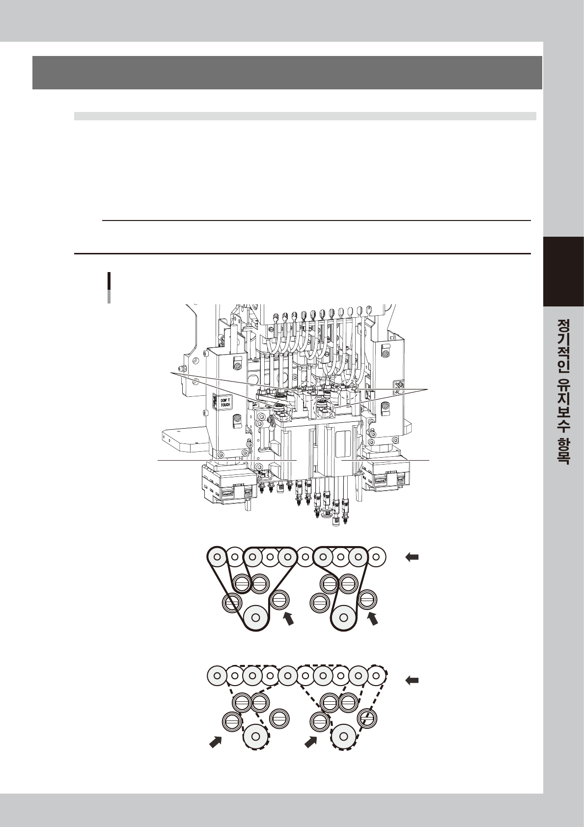 3-45 3 6 . 1 년 6 . 1 R 축 스 플라인 벨 트 의 상태확인 ( 1 년 ) R 축 스플 라 인 벨 트 는 , 4 개 가 있 습 니 다 . 각 벨 트 의 상 태 를 확 인 해 주십 시 오 . ■ R 축 스 플 라인 벨 트 의 확 인 포인트 • 벨 트의 마모와 깎 임 에 의 해 벨트가 풀리지 않 았는 가 ? • 벨 트에 균열과 열 화 에 의해 금이 가지 않았는 가 ? • 벨 트 텐…