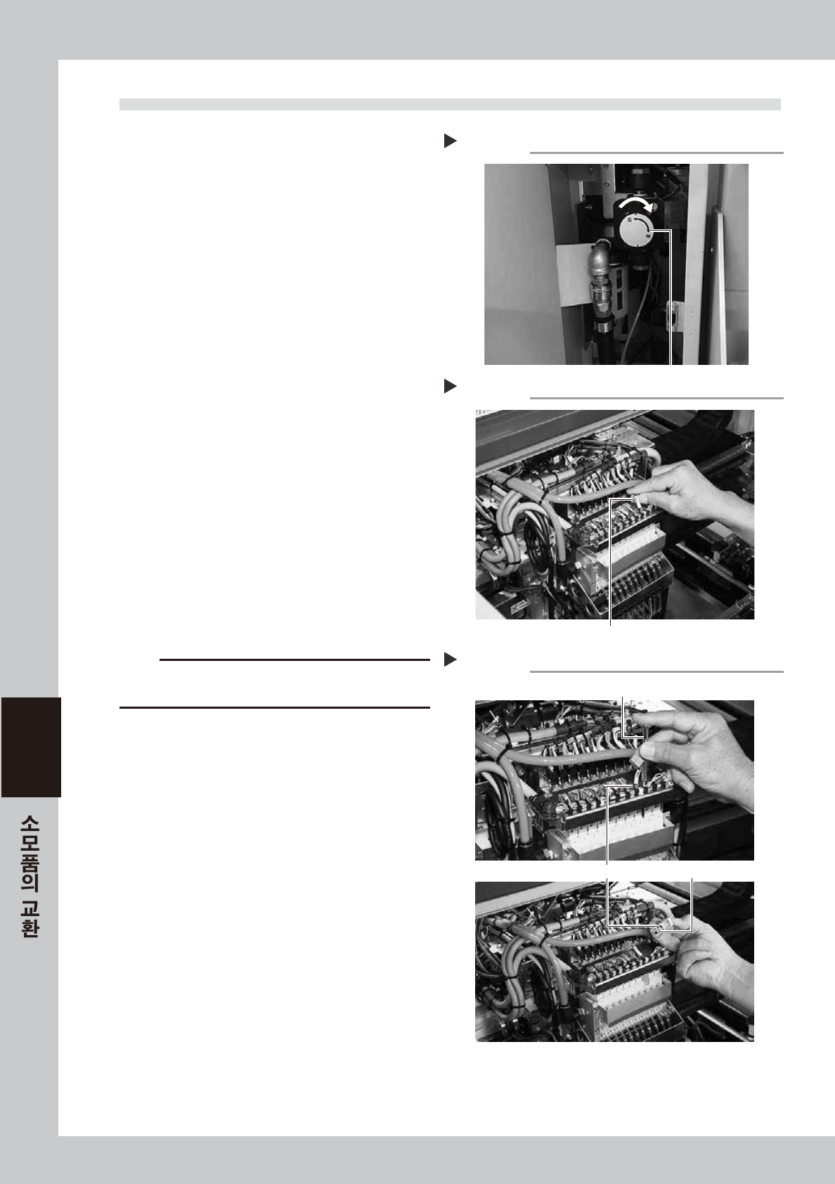 6-7 6 3 .3 청소 용 블로우 밸브 의 교 환 1 공 급에 어와 장비의 전원을 차단합 니다 . 1 . 소 프트 웨어 를 종료 하 고 , 장비의 전원 을 OFF 합 니다 . 2. 장비 좌 측 하단 패 널내 의 「에어 공급 / 배 출」밸 브 를 우측 으로 돌려서 에어 공급 을 차단해 주 십시오 . 5 7 606- L4-00 2 헤드 ( 테이블 ) 를 작 업하 기 쉬운 위치로 이동시킵 니다 …