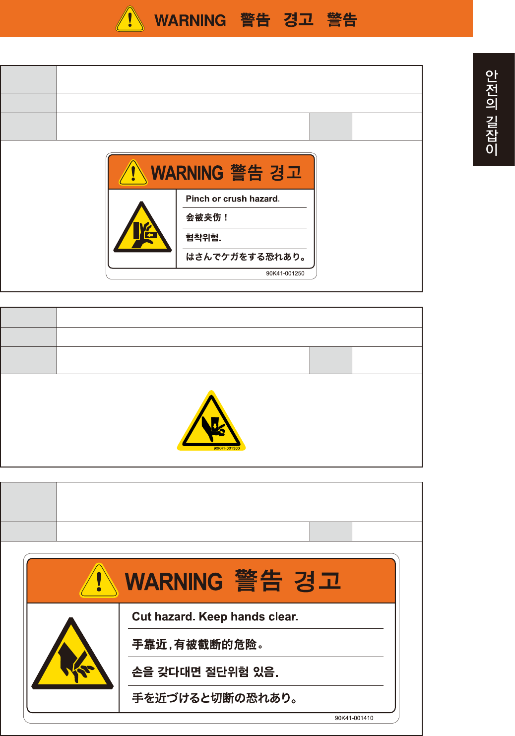 가동부와 커버에 손이 끼여서 다칠 우려가 있습니다 .