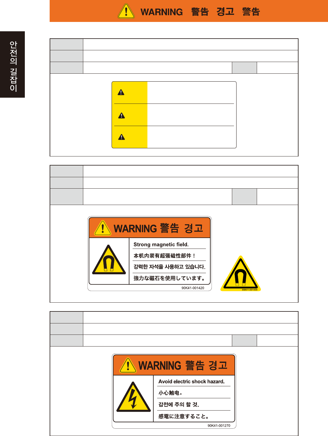 위험의 회피 운전중 또는 매거진을 취급할 경우 , 손 등을 절대로 장비내에 넣지 말 것 .