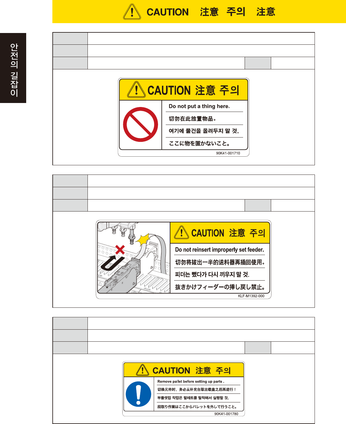 xxvi 위험의 결과 장 비 의 파손 ( 헤드 와의 충 돌 등 ) 원인이 됩니다 . 위험의 회피 일괄교환 대차 ( YSM40 /YSM40 R 용 ) 커버의 상 면 에 물건 등이 없는지 확인한다 . 대상 일괄교환 대차 (Y SM4 0 ) 적용 단계 셋업 위험의 결과 캐리어 테이프 와 헤드가 접촉 해서 , 장 비의 파 손 원인 이 됩니 다 . 위험의 회피 피더세팅 위치에서 빼다 가 만 피더는 ,…