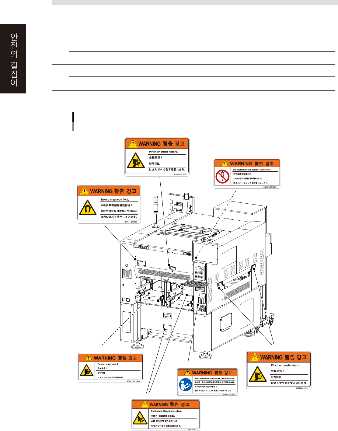xxviii 3 . 4 라 벨부 착 위치 장 비 를 정 확 하 고 안 전 하 게 사 용 하 기 위 해 서 , 본 체 각 부 에 는 경 고표 시 라 벨 이 부 착 되 어 있 습 니 다 . 이 경 고표 시 내 용을 준수 하여 주십 시 오 . 또 한 , 이 항 목에 서 나 타 내 고 있 는 라 벨 이 외 의 안 전 상 의 주 의 사 항 에 관 해 서 는 「 1. 안전에 대해서」 를 참 조 해 주 …