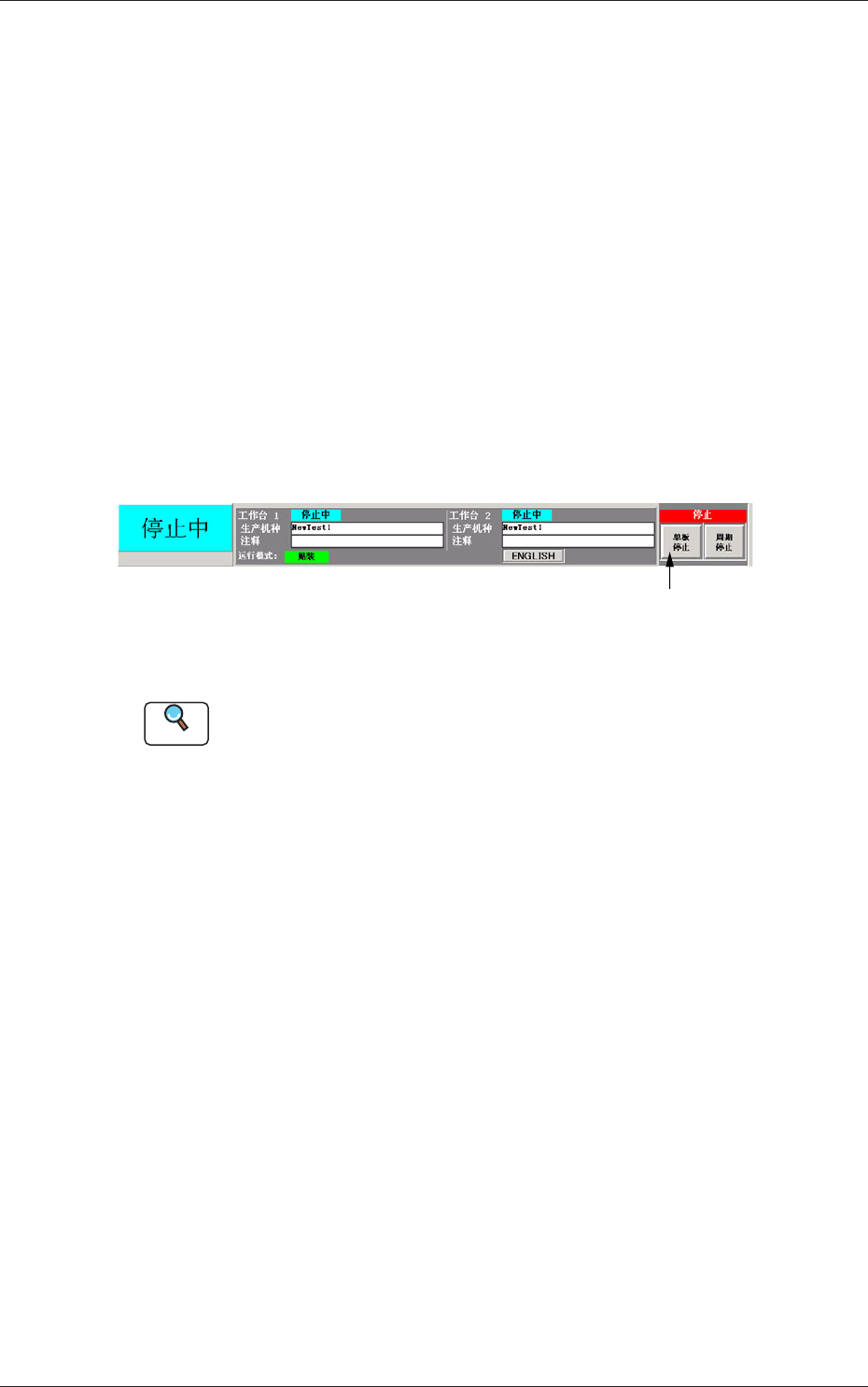此时,操作台的 [START] 按钮灭灯,塔灯的绿色灯灭,生产运行停止。